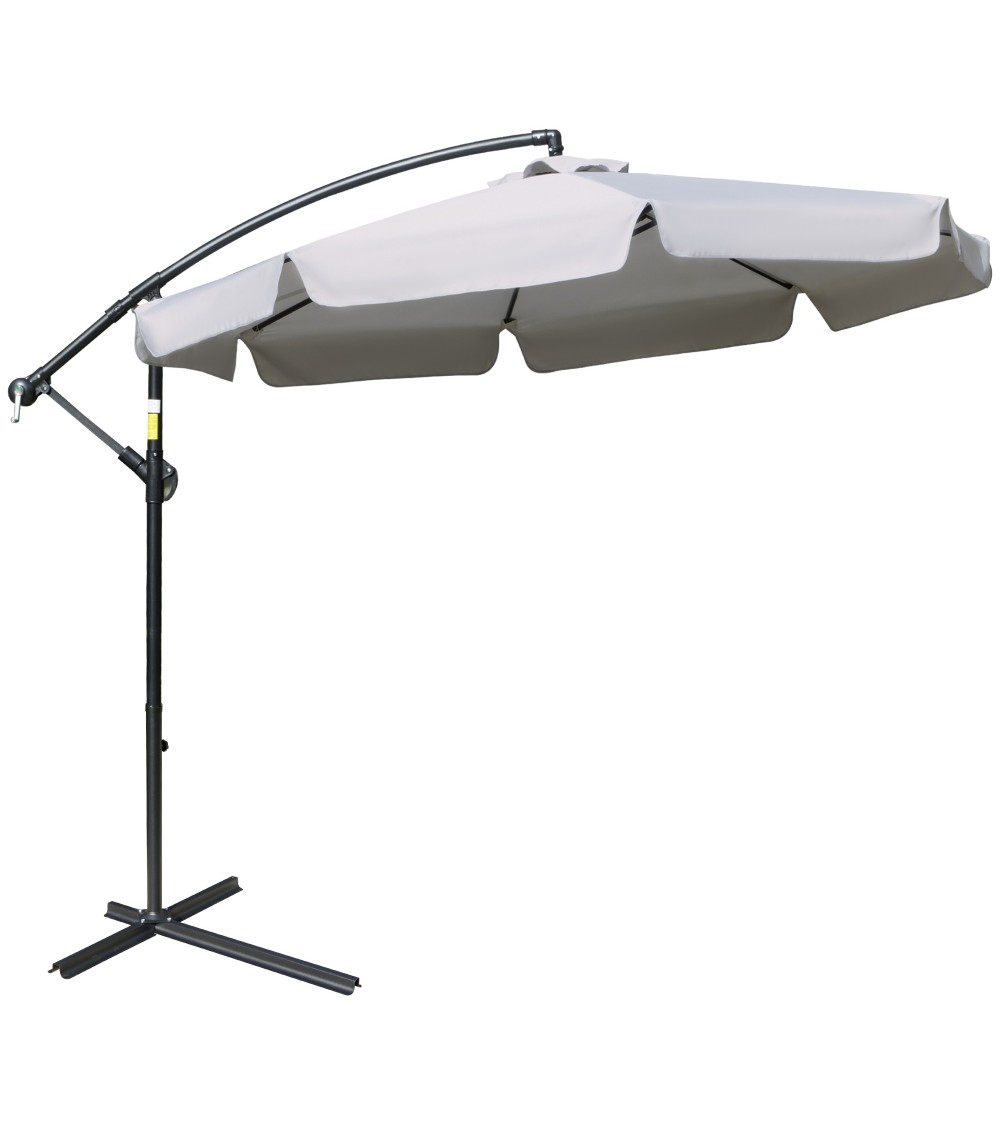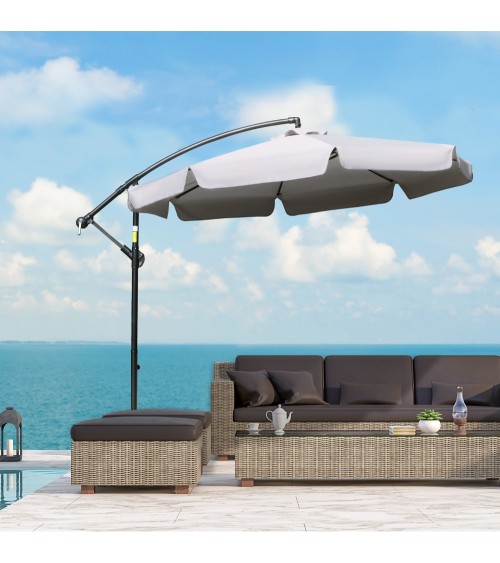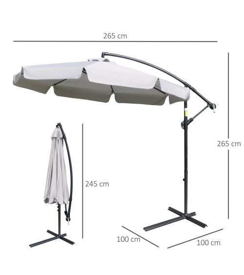 Cet élégant parasol déporté iclinable est idéal pour profiter entre amis ou en famille de votre extérieur ! Pour vous assurer une utilisation pérenne, ce parasol en polyester haute densité est composé de 8 baleines en métal avec piètement robuste en acier époxy anticorrosion. Pratique et design, cet élément indispensable à votre jardin et terrasse vous ravira ! Caractéristiques : - Parasol déporté octogonal grande taille diamètre 2,65 m et hauteur 2,45 m- Design alliant modernité et élégance- Idéal pour profiter d'une grande zone ombragée sur votre terrasse, dans votre jardin ou au bord de votre piscine !- Possibilité d'incliner le parasol en fonction de la hauteur du soleil- Ouverture et fermeture facile grâce à sa manivelle intégrée- Large piètement croix robuste et stable en acier époxy anticorrosion- Toile en polyester anti-UV haute densité 180 g/m² avec lambrequin vague douce et cheminée : prise au vent limitée, aération optimale, usage pérenne- Rangement peu encombrant et montage/démontage facile et rapide (manuel illustré fourni)- NOTE : parasol à installer uniquement sur un sol parfaitement plat et à lester (dalles non fournies) Spécifications : - Couleur : gris clair- Matériaux principaux : acier époxy anticorrosion, polyester haute densité- Dim. totales : Ø 2,65 x 2,45H m- Ø mat : 4,8 cm- Nombre baleines/contrefiches : 8- Dim. piètement : 1L x 1l m- Livraison effectuée en un colis- Réf. : 84D-161LG