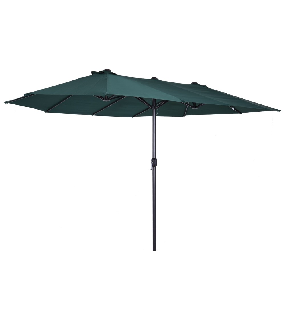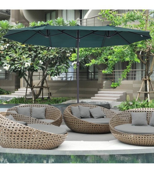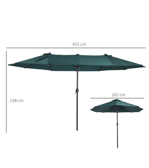 Description : Ce grand modèle de parasol en acier et polyester haute densité couvrant une longueur totale de 4,6 m vous offrira une protection optimale contre le soleil. Vous pourrez ainsi profiter de votre extérieur en famille ou entre amis sans être dérangé pas les rayons intenses du soleil en plein été ! Caractéristiques : - Grand parasol idéal pour ombrager une grande zone dans votre jardin, patio, terrasse, piscine, etc...- Parasol XXL avec grande surface de protection contre le soleil- Composé de 12 entretoises en métal pour un maximum de stabilité- Manivelle d'ouverture fermeture en alliage d'aluminium : fonctionnement pratique et facile au quotidien- Tissu polyester haute densité 180 g/m² : usage pérenne- Mât en acier haute qualité démontable en 2 pièces : transport et rangement plus pratique- Manuel d'instructions illustré fourni- Note : base/socle de parasol non inclus Spécifications : - Couleur principale : vert- Matériaux principaux : acier, polyester haute densité- Ø latéral du parasol : 2,7 m- Largeur totale : 4,6 m- Hauteur totale : 2,4 m- Ø mât : 4,8 cm- Note : base / socle de parasol non inclus- Recommandation d'usage : Il est fortement déconseillé de laisser votre parasol à l'extérieur par mauvais temps (pluie, vent, neige ou grêle)- Réf. : 84D-031V01