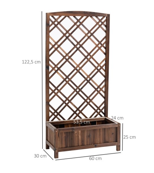 Sublimez votre extérieur avec cette jardinière sur pied et son treillis en bois de sapin traité par carbonisation.Caractéristiques : - Jardinière rectangulaire sur pieds avec treillis idéale pour planter et mettre en valeur vos jolies fleurs, plantes grimpantes ou autre- Conçue et fabriquée en bois de sapin traité par carbonisation : usage pérenne sans entretien- Jardinière robuste : charge max. recommandée de 30 Kg- Drainage optimal de l'eau grâce à son fond à lattes afin d'assurer le bon développement de vos plantes- Montage simple et rapide à l'aide du manuel d'assemblage illustré fourniSpécifications : - Couleur : bois de sapin traité par carbonisation- Matériau : bois de sapin- Dim. totales : 60L x 30l x 122,5H cm- Dim. internes jardinière : 53,5L x 24l x 18,5H cm- Dim. treillage : 60L x 3l x 95H cm- Charge max. recommandée : 30 Kg- Livraison effectuée en un colis- Réf. : 845-388