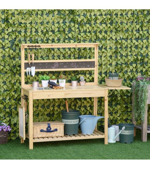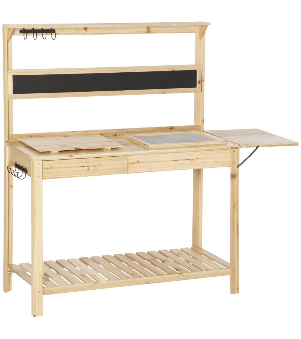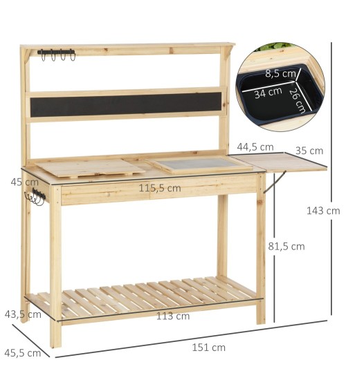 Cette magnifique table de rempotage jardinage en bois de sapin vous permettra de profiter d'un confortable espace de plantation pour vos fleurs, légumes, herbes aromatiques, semis, etc. Grâce à son triple niveau (étagère inférieure, supérieure et plan de travail) et à ses nombreux équipements (tiroir, tablette rabattable, 8 crochets, évier, tamis, tableau noir), jardiner et rempoter deviendra que plus facile, pratique et agréable !Caractéristiques :- Table idéal pour le rempotage de vos fleurs, herbes aromatiques, légumes ou préparation de vos semis- Multi-rangement : plateau principal/plan de travail avec tablette rabattable, 2 étagères, tiroir, 8 crochets- Nombreux rangements très pratique pour avoir tous vos outils et matières prémières à portée de main- Table de rempotage en bois naturel de sapin robuste : parfaite Intégration sur votre balcon, terrasse ou dans votre jardin et usage pérenne- Évier et tamis inclus : idéal pour débarrasser votre sol des cailloux qui empêchent la culture- Tableau noir à craie : utile pour inscrire des notes sur les rythmes de croissance, floraison, la nature des semis, etc.- Convient à une installation en extérieur ou en intérieur- Installation simple et rapide (manuel d'assemblage illustré fourni)Spécifications :- Couleur : bois de sapin naturel- Matériau principal : bois de sapin naturel- Dim. totales : 151L x 45,5l x 143H cm- Dim. plan de travail : 115,5L x 45l x 81,5H cm- Dim. étagère basse : 113L x 43,5l x 10H cm- Dim. rangement plateau : 64L x 43l cm- Dim. rangement tiroir : 43,5L x 38l x 5,5H cm- Dim. évier : 34L x 26l x 8,5H cm- Dim. tablette rabattable : 44,5L x 35l cm- Charge max. reco. : 30 Kg (plan de travail), 30 Kg (étagère basse), 5 Kg (crochet/tiroir), 3 Kg (tablette)- Livraison effectuée en un colis- Réf. : 845-628