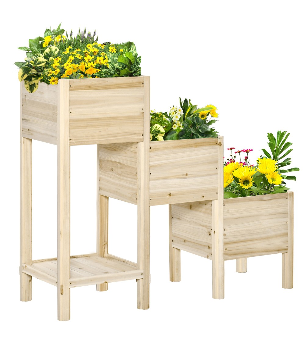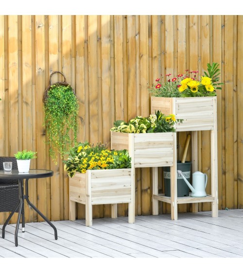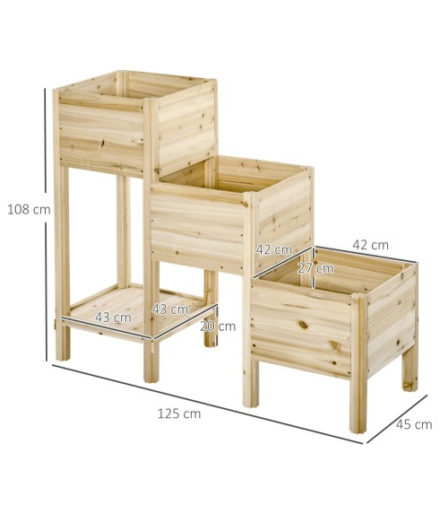 Cette jolie jardinière sur pieds triple niveau en bois de sapin naturel vous permettra de faire vos plantations de légumes, plantes aromatiques ou fleurs sans avoir à vous baisser. Compacte et très élégante, elle s'intègrera parfaitement sur votre balcon, terrasse, patio ou jardin.Caractéristiques : - Jardinière escalier potager sur pieds triple niveau idéal pour jardiner à domicile sans avoir à se baisser- Jardinière triple bac en bois de sapin naturel idéale pour ajouter une touche d'originalité et d'élégance à votre extérieur- Étagère intégrée vous permettant d'y placer quelques décorations ou accessoires de jardin- Triple carré potager grande taille permettant de faire pousser tous types de plantations (légumes, plantes aromatiques ou fleurs) sans ajout d'insecticide- Profondeur de 27 cm vous permettant de faire pousser des végétaux à enracinement moyen- Conçue et fabriquée en bois de sapin robuste pour un usage pérenne- Inserts d'irrigation inclus favorisant l'écoulement de l'eau et optimisant l'oxygénation de la terre et de vos plantes- Montage simple et rapide à l'aide du manuel d'assemblage illustré fourniSpécifications : - Couleur : bois naturel de sapin- Matériaux principaux : bois de sapin- Dim. totales : 125L x 45l x 108H cm- Dim. chaque jardinière : 42L x 42l x 27H cm- Dim. étagère : 43L x 43l x 20H cm- Charge max. recommandée : 20 kg (boîte à fleurs) / 20 kg (étagère)- Livraison effectuée en un colis- Réf. : 845-653