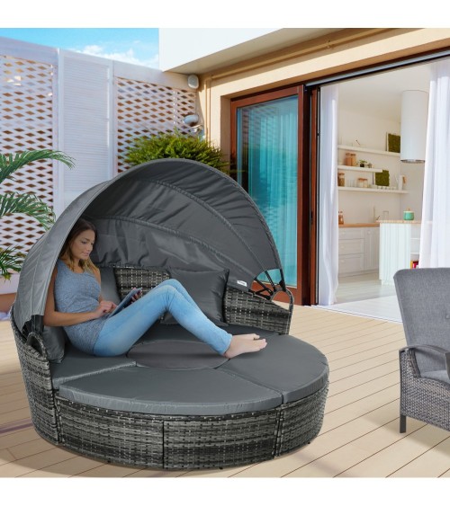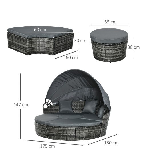 Ce magnifique lit canapé de jardin Outsunny sublimera votre intérieur (véranda) ou extérieur (terrasse, balcon, jardin) grâce à son style cosy très tendance. Son grand confort et sa modularité vous permettront d'en profiter un maximum en toute circonstance, en couple, en famille ou entre amis de quoi épater tous vos convives !Caractéristiques : - Magnifique lit canapé de jardin grand confort qui sublimera votre terrasse, balcon, patio, véranda, jardin et épatera vos amis !- Lit canapé de jardin modulable à votre guise : lit grande taille, canapé avec repose-pieds et table basse, etc...- Grand pare-soleil rétractable intégré : pratique et très utile pour vous protéger du soleil, du vent léger, etc...- Résine tressée en polyéthylène imitation rotin grande résistance contre la pluie, les rayons UV du soleil, le froid, etc... et très facile d'entretien- 5 coussins d'assise déhoussables avec rembourrage mousse de 6 cm d'épaisseur pour un confort optimal- Housses polyester lavables facile à entretenir- Structure robuste en métal époxy anticorrosion pour un usage pérenne- 3 oreillers de décoration coloris gris fournis- Stabilité accrue grâce aux pieds de nivellement antidérapants individuellement réglables- Montage facile à l'aide du manuel d'assemblage illustré fourniSpécifications : - Couleur : gris- Matériaux principaux : métal époxy, résine tressée en PE imitation rotin, polyester et mousse- Dimensions totales : 180l x 175P x 147H cm- Dim. canapés : 60L x 60P x 30H cm- Dim. pouf central/table basse : Ø 55 x 30H cm- Dim. oreillers : 43L x 43l cm- Accessoires fournis : 3 oreillers, 5 coussins d'assise- Charge max. recommandée : 160 Kg (par assise)- Livraison effectuée en 3 colis- Réf. : 862-021