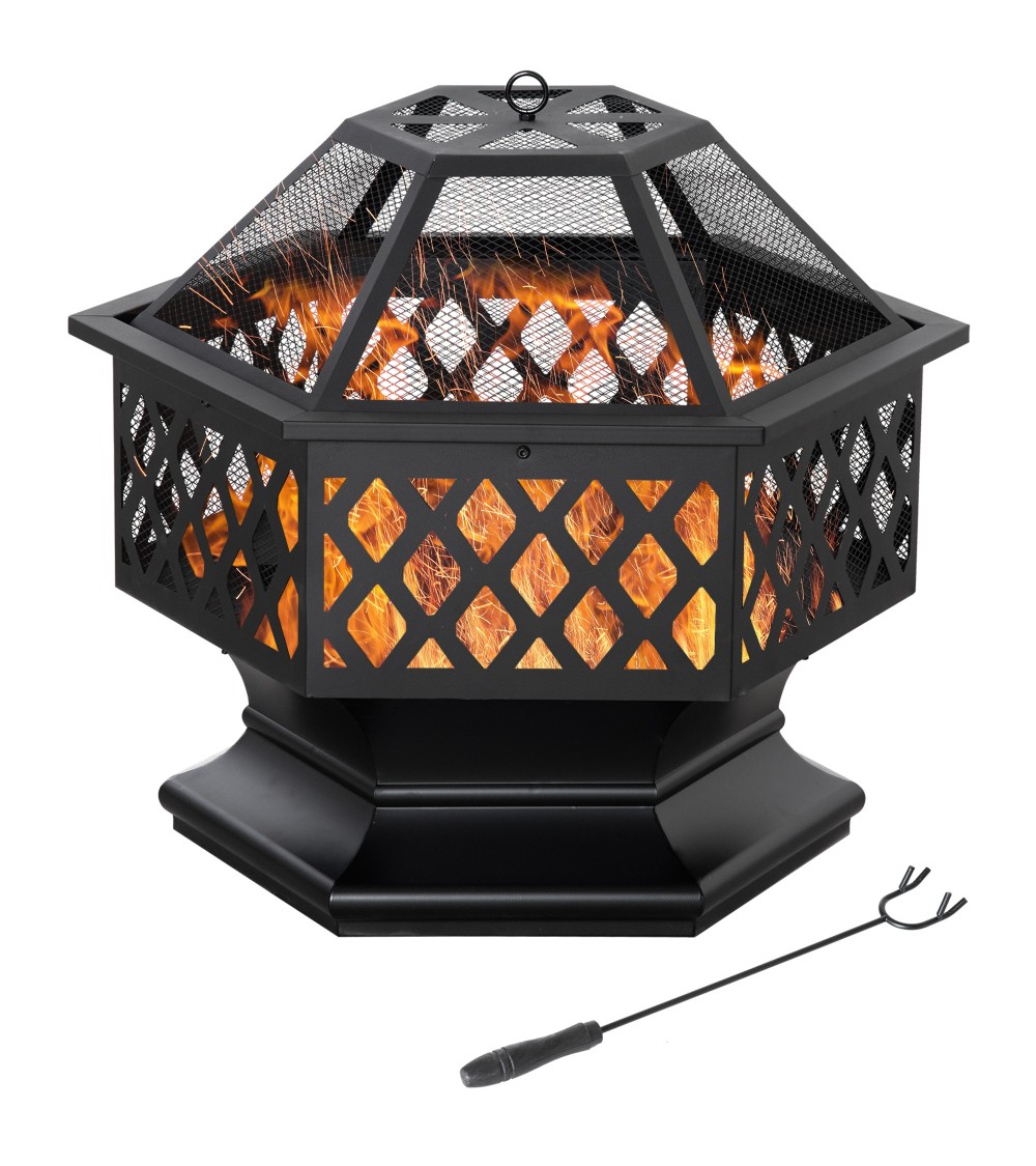 Brasero hexagonal pare-étincelles avec tisonnier acier noir