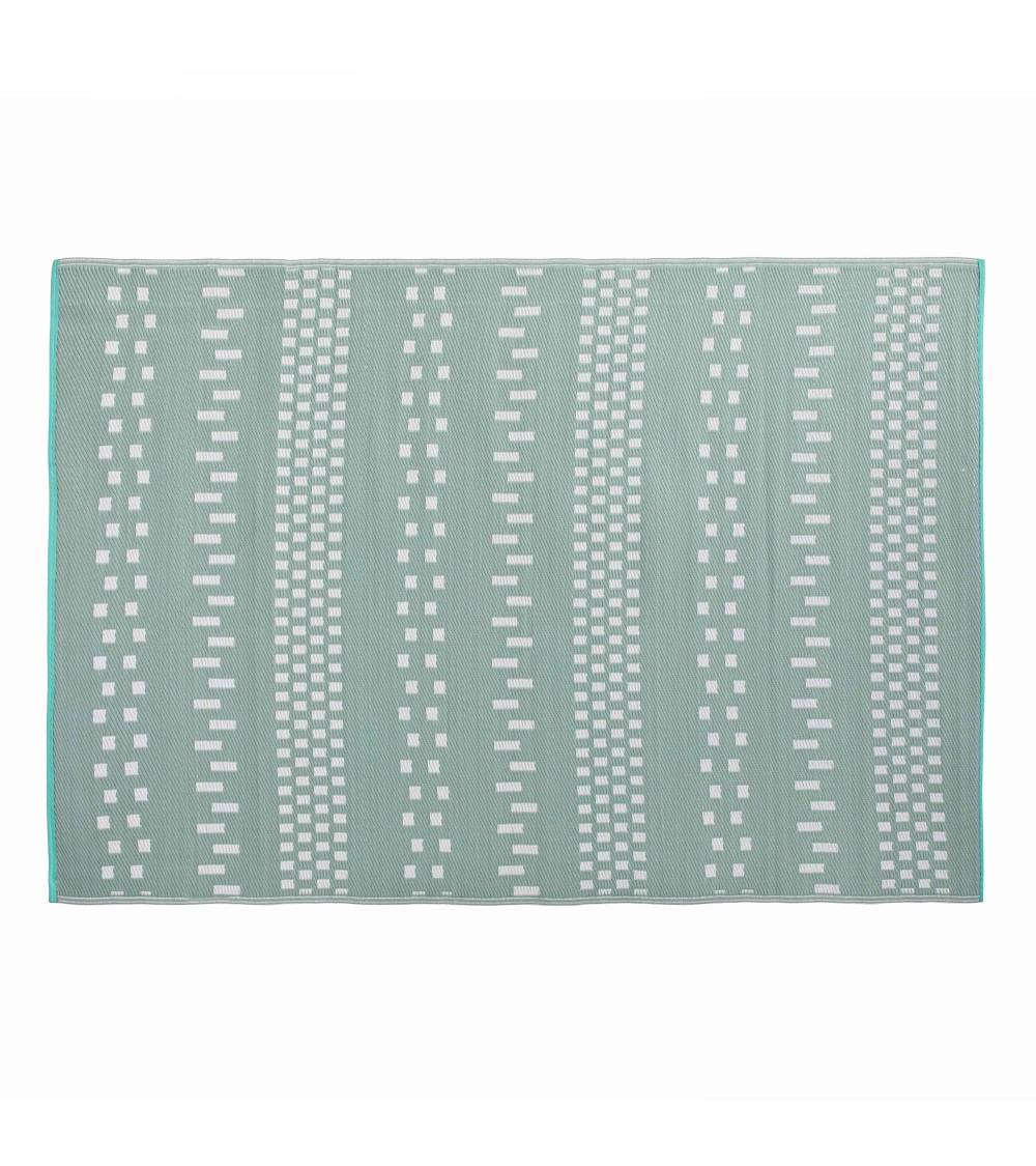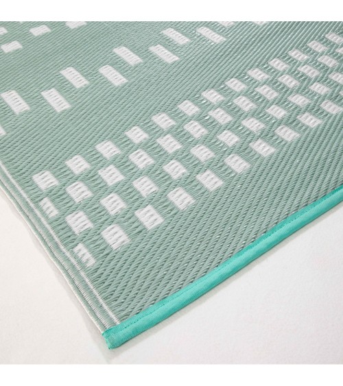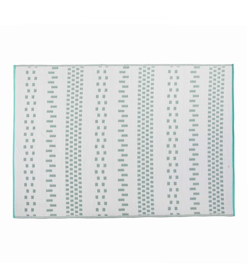 Ce tapis d'extérieur et d'intérieur bleu clair apporte une touche nordique à votre salon ou terrasse. Paré de motifs graphiques et de couleurs douces, il crée une ambiance zen et apaisante. Le tapis est réversible, les couleurs sont inversées sur les deux faces (motifs blancs sur fond bleu ou motifs bleus sur fond blanc). Il est réalisé en polypropylène recyclé, et présente des finitions soignées avec un biais en polyester bleu turquoise de chaque côté. Il est imperméable, déperlant et traité anti U.V. Ce tapis d'extérieur et d'intérieur est proposé dans 3 dimensions : 180 cm x 120 cm, 230 cm x 160 cm, 270 cm x 180 cm. Garantie 1 an - Qualité SOLYS.