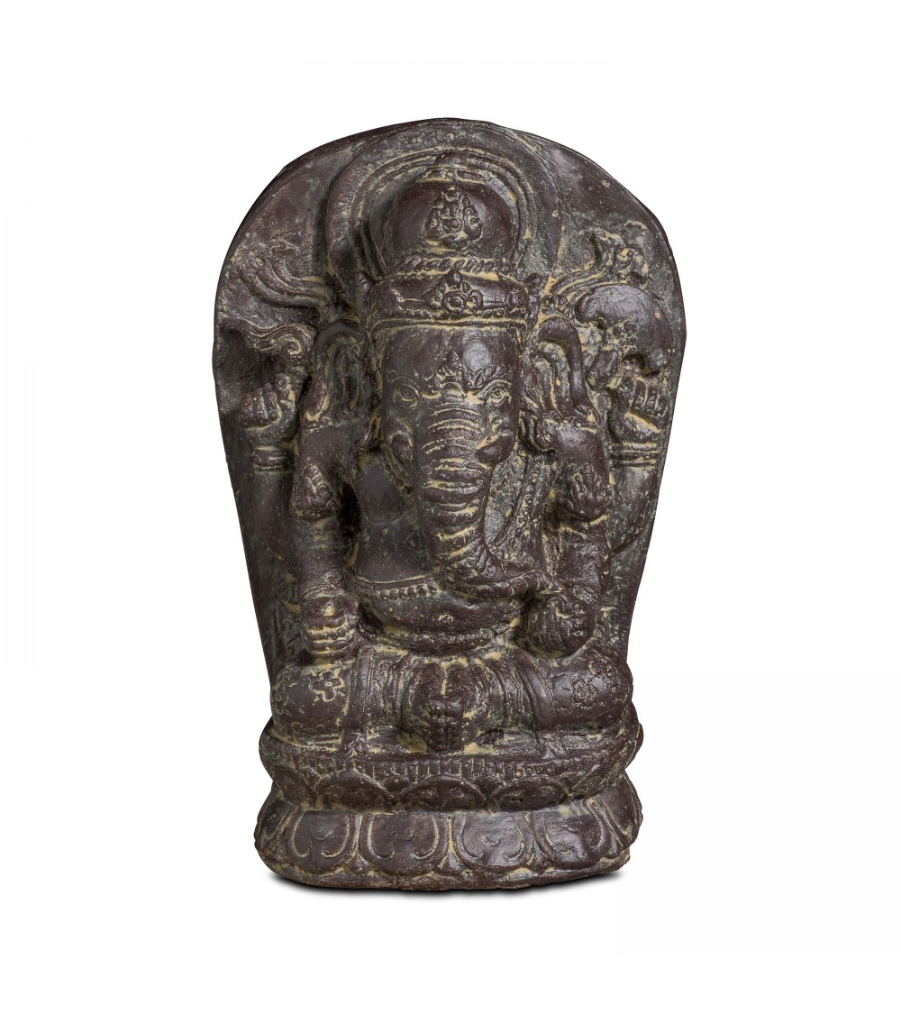 Statue de jardin en pierre naturelle, à l'image de Ganesh, le dieu le plus vénéré dans l'hindouisme. Mesurant 30 cm de hauteur, cette sculpture en pierre représente le dieu aux quatre bras et à tête d'éléphant, patron des écoles et du savoir. Fabriquée en pierre de fonte, la statue de Ganesh résiste au gel et aux intempéries : elle peut donc décorer la maison ou être installée dans le jardin ou sur la terrasse à toute période de l'année. La statue de jardin est d'abord moulée en creux avec de la pierre reconstituée, elle est ensuite confiée à un sculpteur professionnel qui y apporte les touches finales. Une finition patinée confère à la statue de Ganesh un look antique. Chaque pièce est unique et peut comporter de légères variations de couleurs. La statuette de Ganesh pour jardin pèse environ 5 kg et mesure 20 x 10 x 30 cm. Elle ne nécessite aucun traitement et ne demande pas d'entretien particulier.