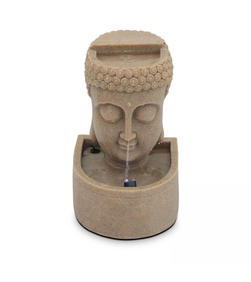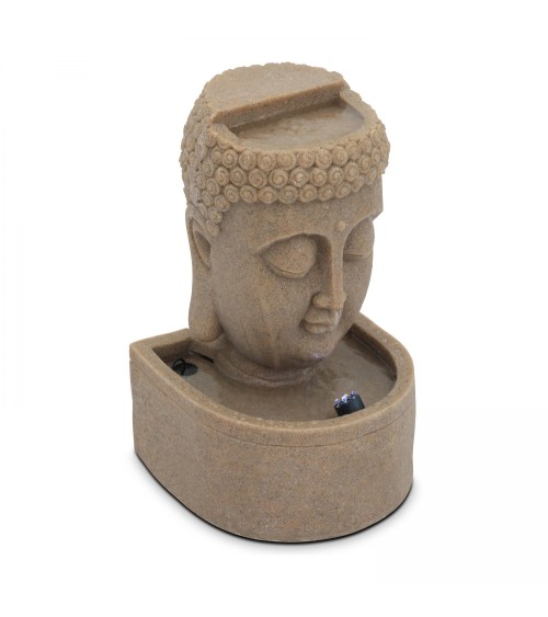 Fontaine de jardin en forme de tête de Bouddha. La fontaine d'extérieur avec une tête de Bouddha, symbole de plénitude et d'équilibre intérieur, est un accessoire déco pour le jardin, le balcon ou la terrasse. Le ruissellement de l'eau, qui se fait en circuit fermé, génère un bruit de fond discret et apaisant. La fontaine tête de Bouddha est munie d'une LED de couleur blanche qui offre un éclairage d'ambiance le soir et la nuit, tout en mettant votre extérieur en valeur. La fontaine Bouddha pour jardin est conçue pour une durée de vie optimale en extérieur, elle est intégralement construite en polyrésine et fibre de verre, avec projections de poudre de verre pour un rendu granit naturel. La fontaine de jardin en fiberstone est résistante aux rayons ultraviolets et aux intempéries : vous pouvez l'installer dehors tout au long de l'année. Le système de pompe s'installe en toute facilité, il est fourni avec un câble d'alimentation d'une longueur de 5 m. La fontaine avec tête de Bouddha mesure 28 cm de côtés et 46 cm de hauteur. La notice pour le montage est incluse.