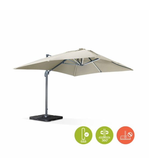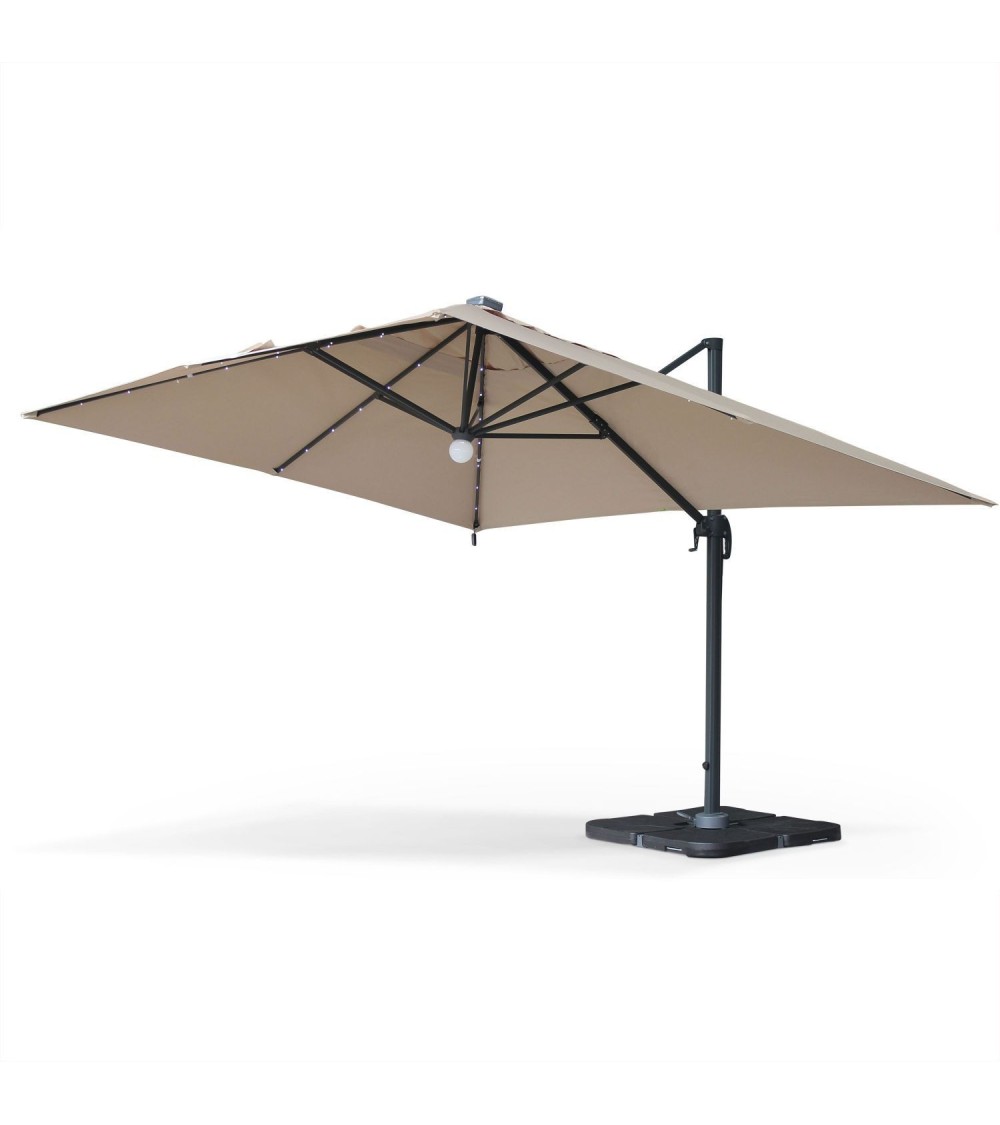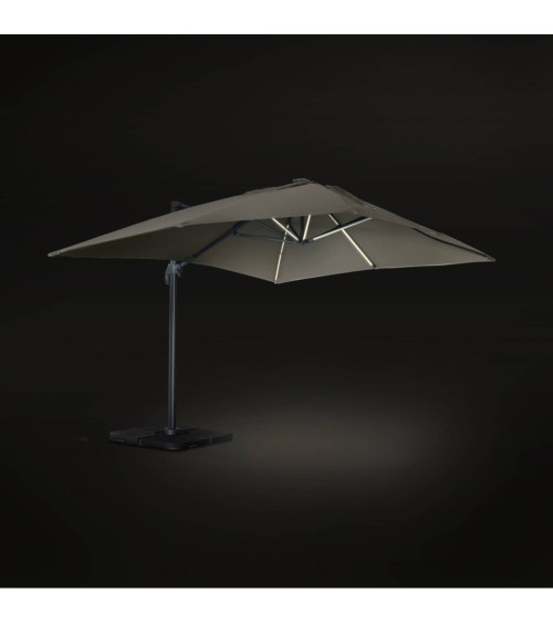 Luce est un beau parasol de jardin au design sobre et élégant. De forme rectangulaire, ce parasol déporté 3x4m vous abrite du soleil mais éclaire également vos soirées, grâce à son système LED à chargeur solaire. Par ailleurs, le parasol Luce est bien pensé. Il se manipule aisément grâce à sa manivelle anti-retour, à sa poignée dinclinaison et à sa pédale de rotation. Il sadapte à vos besoins car il est inclinable et rabattable à la verticale, une fois ouvert. Son auvent sur le sommet, permet à lair de bien circuler. Toile de 3x4m, environ 12m². Rotation de 360 °. Inclinable et rabattable à la verticale une fois ouvert. Toile de 250 gr/m2 env. avec aération au sommet. Larmature et les 8 baleines sont en aluminium. Dimensions du mât : 50x78mm (Alu : 2mm dépaisseur). Housse en polyéthylène noir, avec fenêtre en PVC transparent. Nombre de LED : 49 (7 par longue baleine (4), 6 par baleine moyenne (2), 4 par baleine courte (1), 5 dans le lampion central). Chargeur : Solaire ou secteur (4,2V), 3 batteries AA rechargeables (1,2V, 1500mAH)Temps de charge : 2 à 3 heures. Temps dutilisation : 2 à 3 heures (fonctionne en étant branché sur secteur). Hauteur du parasol : 2m70 (2m au point le plus bas). Poids : 30 kg. Attention, les dalles nécessaires pour lester le parasol ne sont pas fournies, vous retrouverez une sélection de dalles dans notre boutique (remplissables ou en résine). Vous pourrez trouver également des lests spéciaux en béton (de 40x40cm à 50x50cm), dans les grandes surfaces de bricolage.