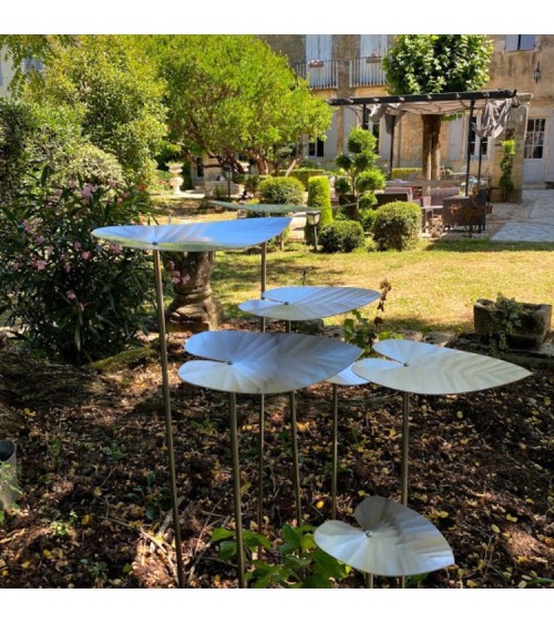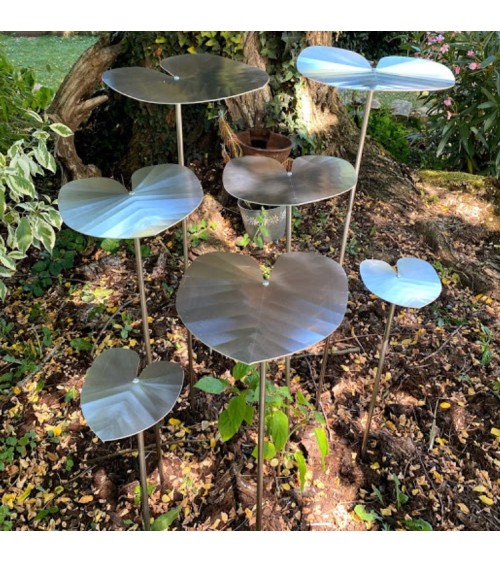 Collection FLEURS & FEUILLES LP design, ce kit de 6 feuilles nénuphar et 6 tiges (visserie comprise) est spécifiquement conçu pour être disposé en extérieur : dans la végétation, en pleine terre, dans un joli bac à fleurs, dans la pelouse... Vos feuilles ne rouilleront jamais. Le plus produit : les associer à l'un de nos cactus. Kit à monter soi-même Feuilles 100% aluminium et Tiges 100% inox. Dimensions : Tige 1m et feuille 29x32cm / Tige 86cm et feuille 23x26 / Tige 60cm et feuille 15x18cm - Modèle déposé à l'INPI. FABRICATION FRANÇAISE