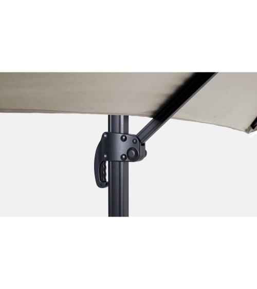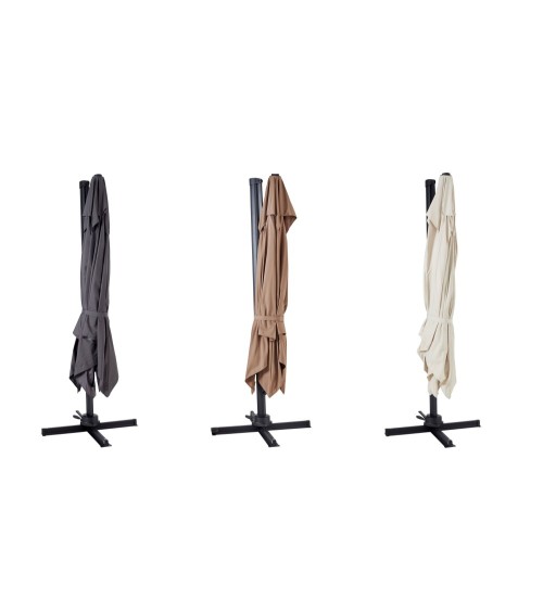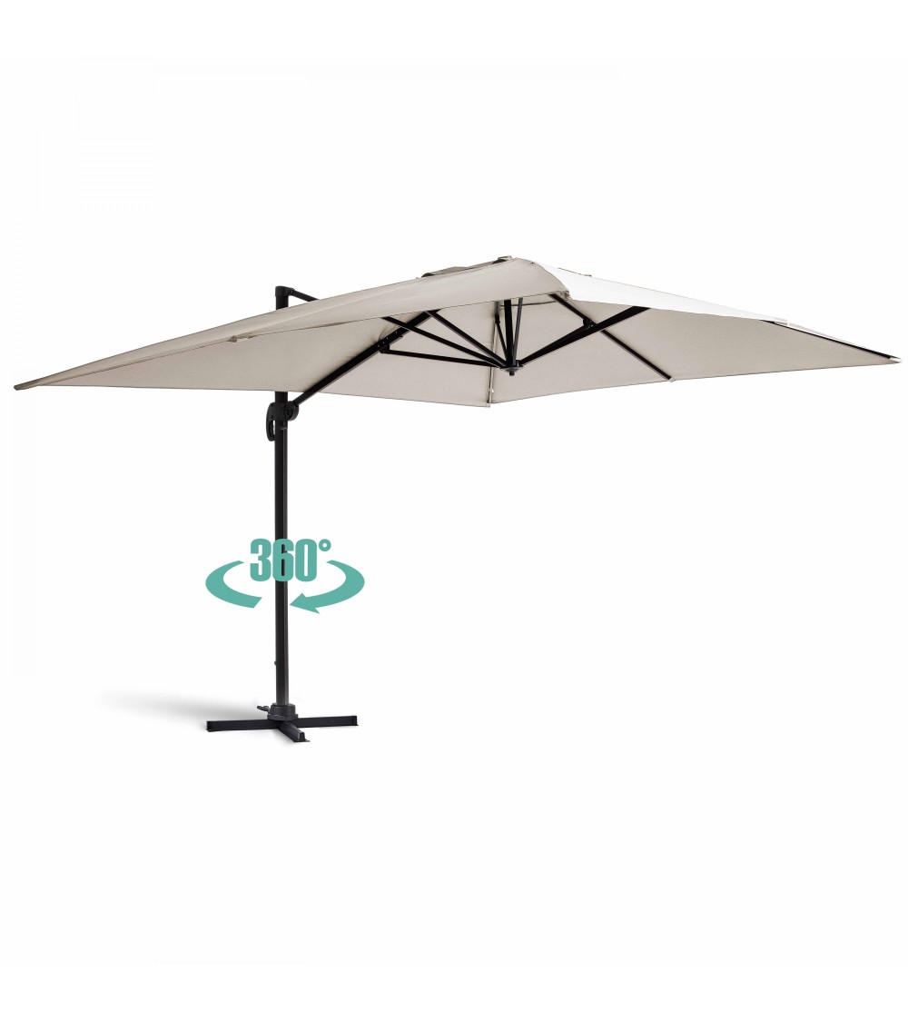 Produit à usages professionnels et particuliers - Compagnon idéal de vos repas sur votre terrasse et moments détente en plein air, le parasol déporté rotatif CASERTA fournit une protection maximale contre les rayons du soleil, et ce toute la journée durant grâce à sa structure articulée. Son mât central est rotatif à 360° et son mât déporté est inclinable : il peut donc être aisément et rapidement orienté de façon à en optimiser la surface d'ombrage. La toile 100 % polyester se déploie et se replie facilement sur action d'une poignée, et est protégée anti-UV et imperméabilisée avec une enduction PVC. Celle-ci mesure 4 x 3 m et fournit jusqu'à 12 m² de surface d'ombrage. Le parasol rectangulaire déporté ne demande aucun entretien, sa structure en aluminium étant résistante à la rouille et aux intempéries. La notice et l'outillage pour l'assemblage sont inclus, les dalles de lestage sont vendues séparément.Matière : Structure 100 % aluminium, finition peinture epoxy noireToile 100 % polyester avec enduit PVCCroisillon du pied : 100 % acierBaleines : 100 % aluminiumCaractéristiques : Surface d'ombrage 12 m² - Rotation 360° Mât central : 78 mm x 50 mm Mât déporté : 18 mm x 35 mm Armature 8 baleines : 17 x 25 mm Poids du parasol : 28 kg Plus produit : Elégant et robuste S'ouvre et se ferme facilement grâce à une poignée qui glisse le long du mât central Toile imperméable et traitée anti UV pour éviter la décoloration Le montage se fait en quelques minutes, les outils sont fournis ainsi que la notice