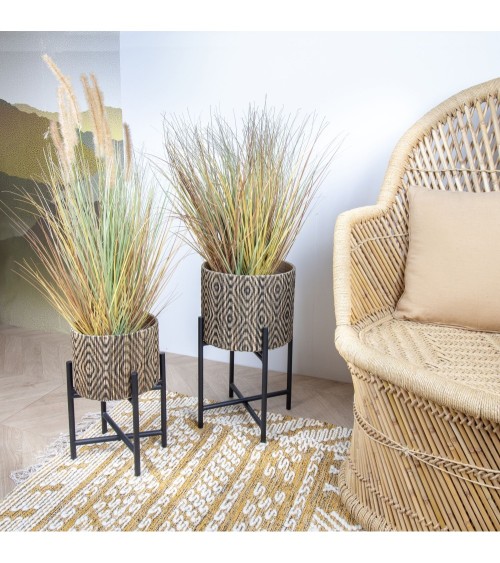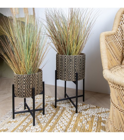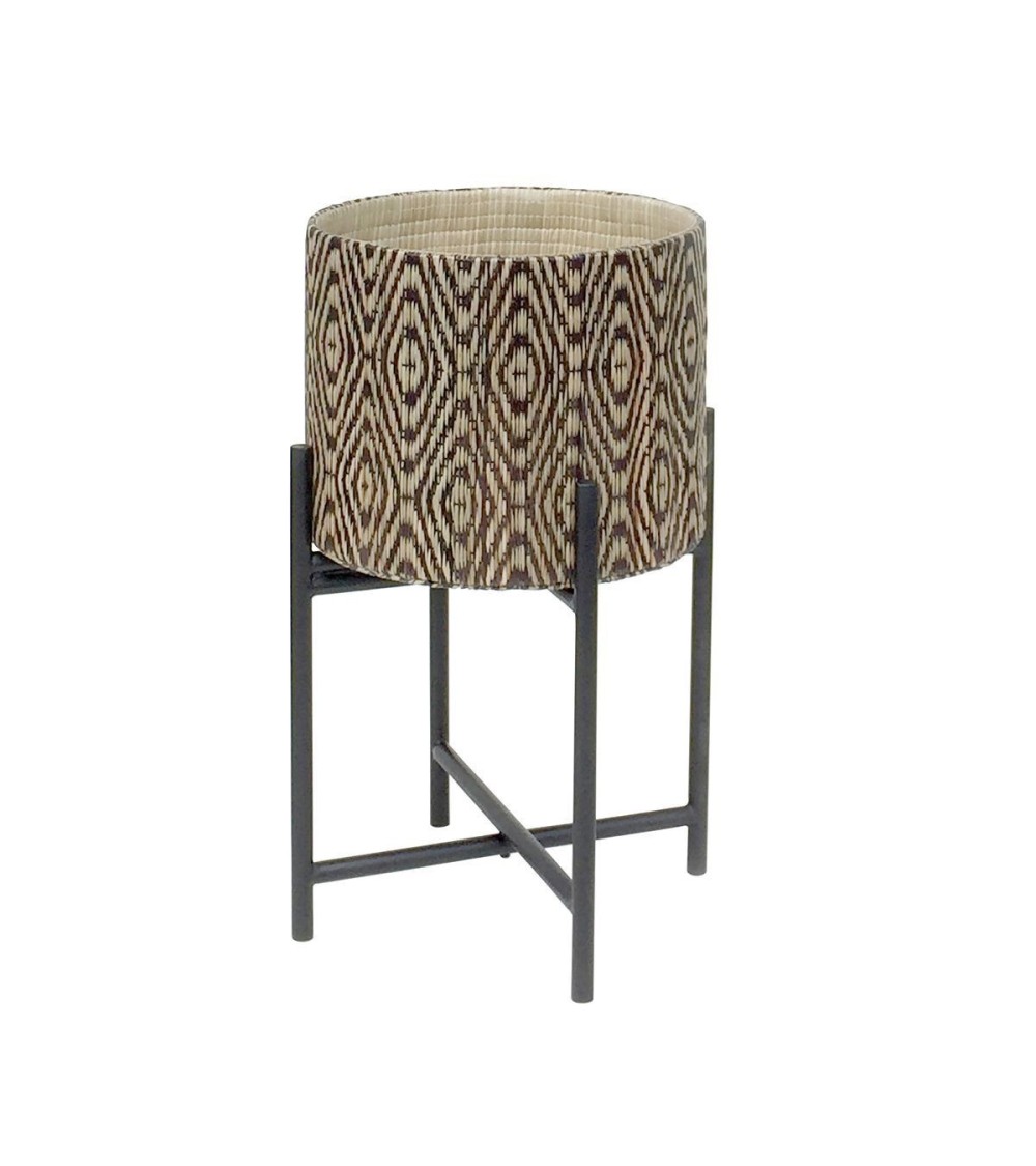 Ce petit cache pot sur pieds est d'inspiration contemporaine, il se distingue par sa structure circulaire et son petit côté élégant. Le résultat est 100 % chaleureux et exotique. Alors, pourquoi s'en priver? Cache pot sur pieds metalliques noirs Modèle de taille moyenne DIAM 33 HT52.5 CM Usage intérieur ou extérieur abrité. Ne pas exposer aux intempéries. Nettoyer à l'aide d'un chiffon sec