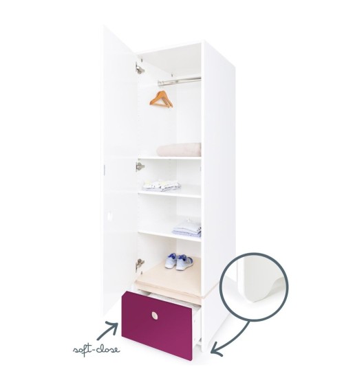 COLORFLEX, une armoire enfant design, modulable et personnalisable !L'armoire enfant 1 porte COLORFLEX est équipée d'une grande porte et d'un tiroir, séparés par une planche de contreplaqué de bouleau. Le système de fermeture Soft Close, doux et silencieux, assure un maximum de confort et de sécurité.L'armoire enfant 1 porte est vendue avec 3 étagères réglables en hauteur et 1 tringle. Le sens douverture des portes est au choix - gauche ou droite. Pour les poignées, deux positions possibles - basse ou haute.Grâce à une palette de 17 couleurs, de nombreuses combinaisons sont possibles - créez la chambre qui vous correspond !En fonction de l'espace dont vous disposez, découvrez les armoires 2, 3 et 4 portes de la collection COLORFLEX. Il existe deux structures de base - une structure 2 portes et une autre structure 1 porte. En combinant les deux (2+1 et 2+2), il est ainsi possible de concevoir une armoire 3 ou 4 portes. La collection COLORFLEX évolue en fonction de vos besoins !ECOFRIENDLYLa collection COLORFLEX a été réalisée selon une approche éco.responsable. Le mobilier est réalisé à base de MDF au bilan carbone neutre et de contreplaqué bouleau labellisé FSC 100 pour cent issu de forêts gérées de façon durable et raisonnée. Les peintures utilisées sont à base d'eau et respectent les normes européennes des jouets pour enfant.INFORMATIONS TECHNIQUES -Matériaux - Contreplaqué bouleau et MDFCouleur Structure - white Couleur Façade Tiroirs - personnalisableDimensions - 180cm (hauteur) x 52cm (largeur) x 60cm (profondeur) Livrée à monter Design Italien, fabrication Chinoise sur les lignes de production Hape, entreprise Allemande, leader mondial du jouet en bois Armoire conforme aux normes européennes Garantie 2 ans Utilisable pour tout âge