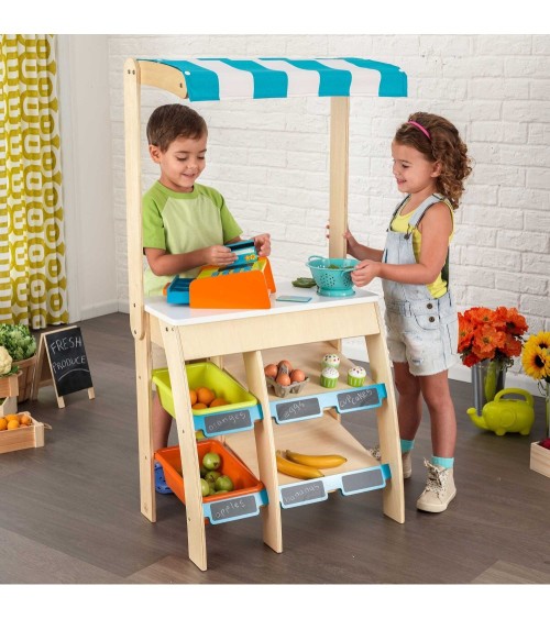 La très belle marchande en bois KidKraft est un jeu d'imitation incontournable pour les enfants à partir de 3 ans. Une belle idée de cadeau ! La marchande est un jeu merveilleux. Elle permet de développer le langage par le jeu d'imitation, de développer les liens sociaux et amicaux. C'est également un excellent moyen d'apprendre à compter et d'aborder la notion d'addition et de soustraction. La très belle marchande en bois de KidKraft est équipée d'étagères et de 2 rangements pratique amovibles sous le comptoir. De petites ardoises à la craie permettent d'étiqueter les aliments La marchande est livrée avec une caisse enregistreuse en bois au tiroir qui s'ouvre et une carte de crédit factice. . Marchande en panneaux MDF . Montage facile. Fourni avec des instructions d'assemblage détaillées étape par étape . Dimensions - H - 120 x L - 61 x l - 41 cm. . poids - 10 kg . Dimensions de la boite - 77 x 41 x 18 cm . Pour les enfants à partir de 3 ans.
