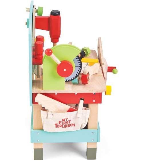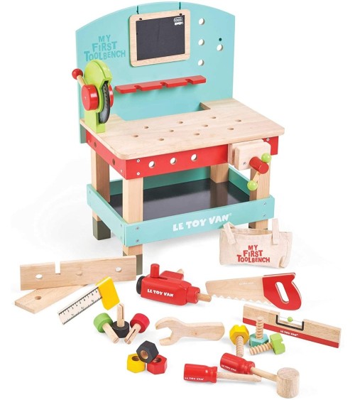 Il est temps pour les petits bricoleurs de laisser place à l'imagination et de construire de véritables chefs.d'uvre! Les enfants craqueront pour cet etabli en bois Le Toy Van, avec tout pleins de détails amusants et interactifs. Cet établi pour les petits bricoleurs contient de nombreux accessoires - une perceuse, une scie sauteuse, un marteau, une scie à main, un tournevis, un niveau à bulle, une règle à angle droit, un étau, une clé et un tableau. Il comprend également  une étagère de rangement, 2 planches déjà percées ainsi que des vis et boulons.Mon premier atelier, un jeu d'imitation en bois de la marque Le Toy Van. Référence TV448.