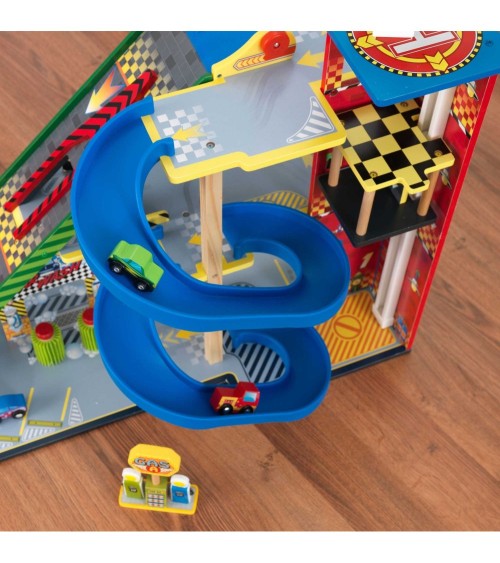 Ensemble garage et rampe de voitures de course en bois KidKraft pour jouer aux petites voitures. La pièce centrale de cet ensemble de course format géant est la ''Méga.rampe'' qui propulse les voitures dans les airs. Livré avec 5 véhicules. Dimensions H - 89 x L - 57 x P - 41 cm. Dès 3 ans.