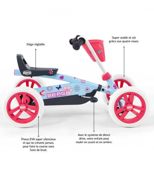 Idéal pour une fille comme pour un garçon, le kart à pédales Buzzy Bloom est signé par la marque Berg. Confortable et sécurisé pour votre bambin, il est la promesse d'agréables moments passées en extérieur à jouer de manière ludique.Caractéristiques produitMarque - BergPneus silencieux EVA increvablesAvec pédales4 roues tout terrains pour plus de stabilité et de sécurité pour votre enfantAxe pivotantSystème de transmission direct pour un pédalage souple et légerVolant et selle réglablesCouleur multicoloreDe 2 à 5 ansTaille de l'enfant - de 85 à 115cmPoids maximum de l'utilisateur - 30kgPoids Net - 7.2 KgKart à pédales Berg - 83 x 49 x 50 cmProduit Berg garanti 24 Mois.