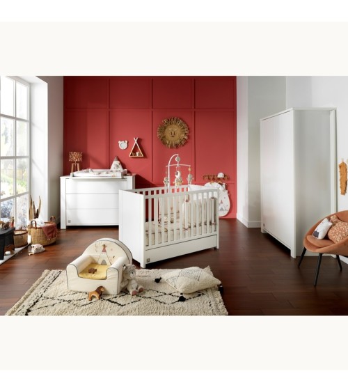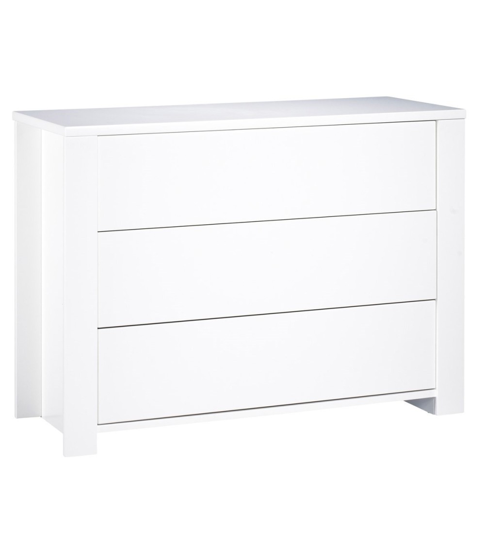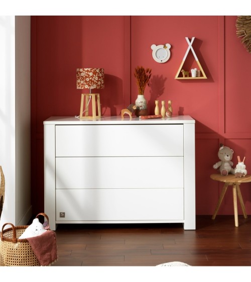 Loft blanc, la chambre blanche universelle aux lignes design avec la commode 3 tiroirs.Détails du produit-Cotés en panneaux de particules mélaminés blanc laqués 1 face blancDessous en panneaux de particules mélaminés blanc, chant avant laqué blancDessus, et montants en panneaux de fibres (MDF) laqués blancFaces tiroirs, en panneaux de particules mélaminés décor blanc, laquées 1 face blancTiroirs sur coulisses invisibles avec pousse.lâche.Dimensions- 130x95x53cmDimensions d'un tiroir- 106x18.2x43.4cmNormes et qualité-Garanti sans solvantPanneaux garantis avec une teneur en formaldéhyde de 4 mg/100gFabrication françaiseMeuble à monter soi.mêmeAfin d'utiliser la commode en toute sécurité, elle doit être fixée au mur (sangle fournie)Conseils d'entretien-Dépoussiérage chiffon sec - ni alcool, ni solvantTaches rebelles - éponge légèrement humideSauthon, entreprise française spécialiste de la puériculture développe pour vous des chambres de bébé depuis 1948!