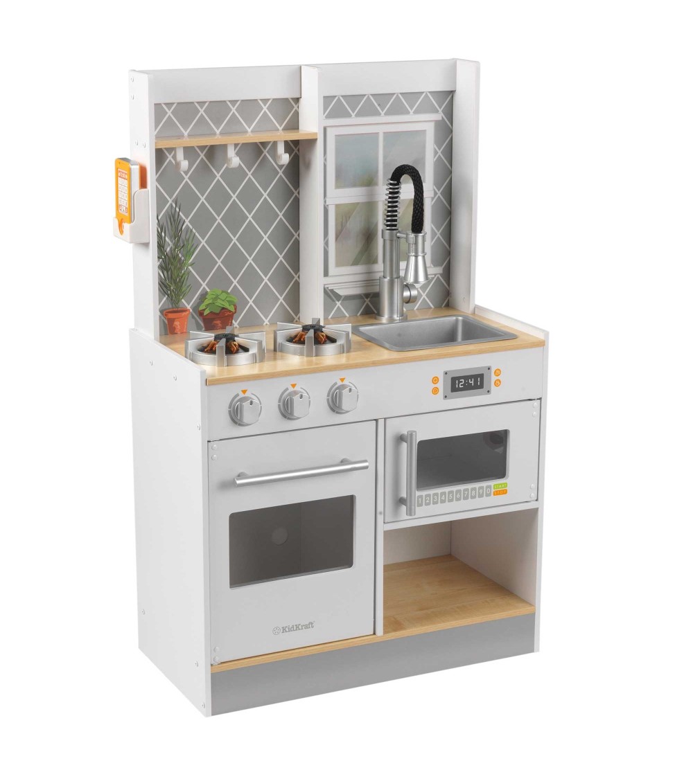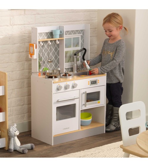 La cuisine Bon Appétit de KidKraft plait aux enfants à partir de 3 ans avec ses 2 brûleurs qui émettent du son et de la lumière. Cette cuisine est équipée de - Un four avec les boutons cliquent, un four à micro.ondes, un robinet avec douchette factice, un évier, des rangements, un téléphone portable factice. Cuisine en bois MDF Dimensions - H - 90 x L - 59 x l - 32 cm A monter. Dès 3 ans