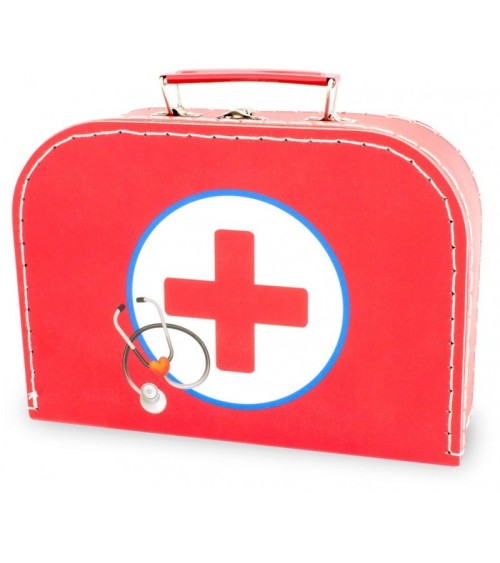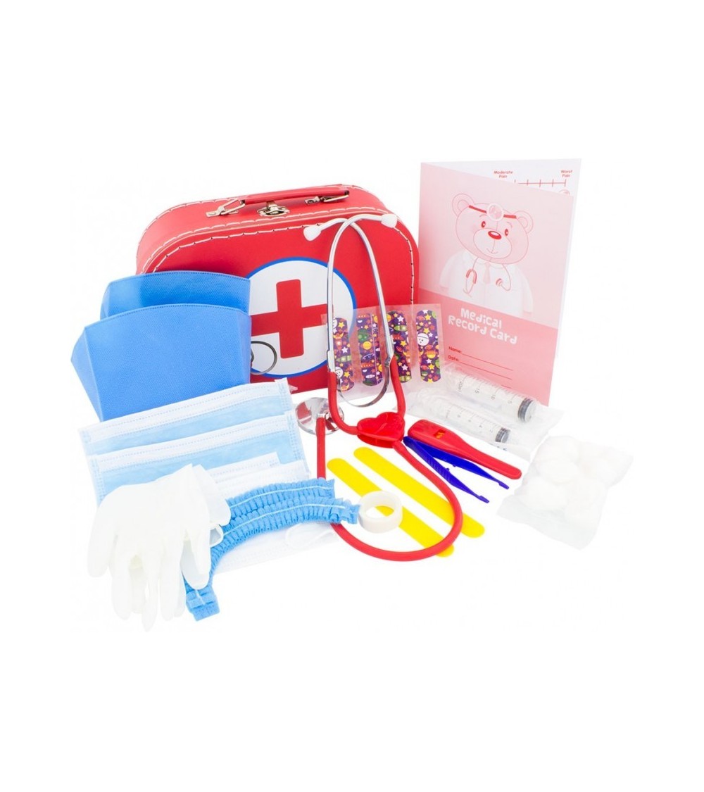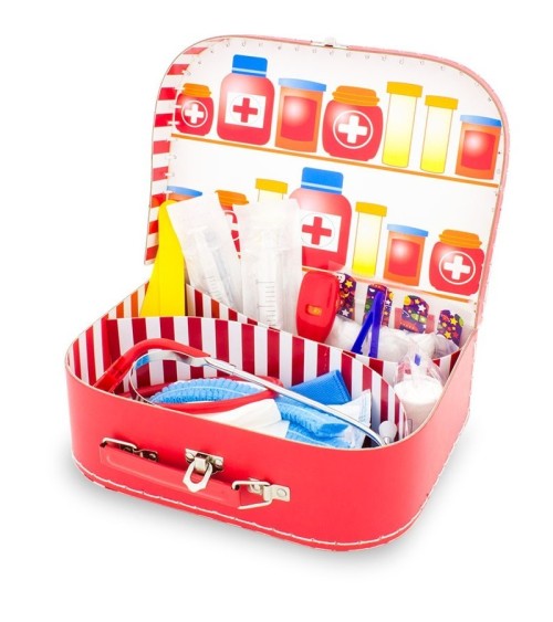 Cette mallette de docteur contient tout ce dont un bon docteur a besoin pour soigner les petits bobos.Cette mallette en carton comprend - 1 carnet de soin, 1 stéthoscope (fonctionnel), 2 masques à élastiques GM bleu, 2 masques à élastiques PM blanc, 2 calots de chirurgien, 2 charlottes, 1 paire de gants en latex, 2 abaisses langue en plastique jaune, 1 thermomètre en plastique, 1 pince anatomique en plastique bleue, 1 sachet de coton, 1 rouleau de sparadrap, 1 bande extensible (rouleau), 4 pansements colorés et 2 seringues (10 ml et 20 ml).Mallette Hôpital de la marque Ulysse. Référence 5059.