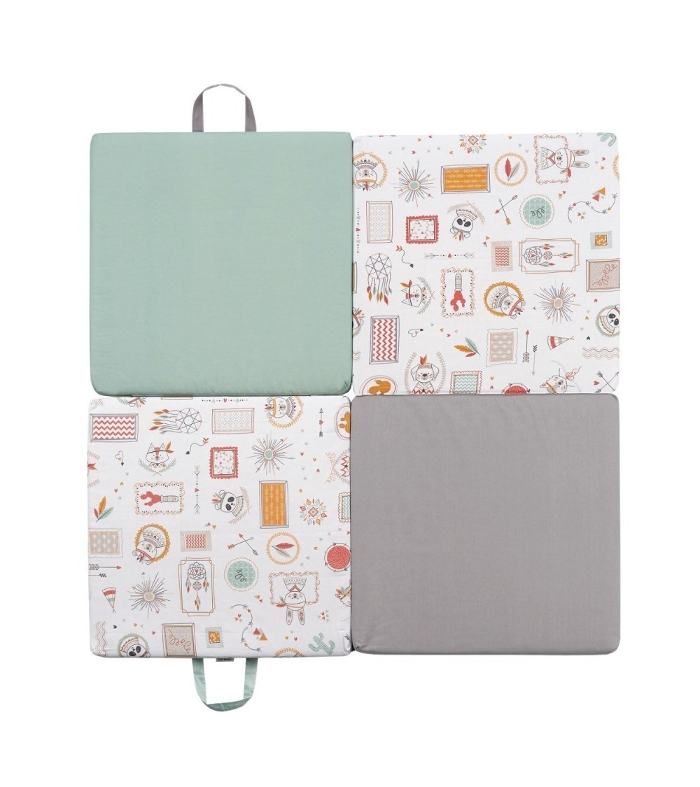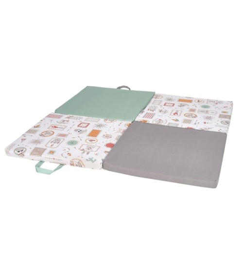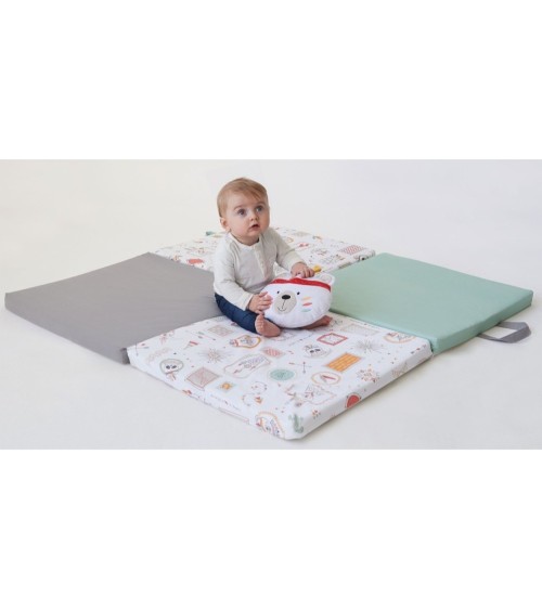 Le tapis d'éveil Tinéo est un tapis malin multifonction 3 en 1 - Non plié, il offre un véritable tapis de jeu (120 cm x 120 cm) Plié en 2, il devient un couchage d'appoint (120 cm x 60 cm x 8 cm) Plié en 3, il se transforme en pouf pour un siège d'appoint et/ou pour ranger facilement le produit à la fin de la journée. Ce tapis d'éveil Tinéo est facile à installer et à plier grâce à son système d'attache et de pliage, vous pourrez aussi le ranger très facilement. Le tapis de motricité Tinéo se compose d'une mousse en fibres de polyester d'une densité de 650 g/m3 pour une épaisseur de 4 cm. Le tapis malin dispose d'un dessous en polypropylène très résistant qui assurera la longévité de votre tapis d'éveil. La housse quant à elle est fabriquée entièrement à partir de coton pour être douce au contact de la peau de bébé. Bébé va passer beaucoup de temps à développer sa motricité sur ce tapis de jeux. Il est donc normal qu'il salisse celui.ci. C'est donc pour cela que Tinéo a développé le tapis d'éveil en le rendant entièrement déhoussable. Cela vous permettra de laver la housse en machine à une température de 30 degrés. Ce tapis d'éveil est fabriqué en France. Conseil pour les parents - Pour accroître l'éveil de bébé, il est important d'acheter des accessoires avec votre tapis d'éveil afin de stimuler davantage les sens de bébé. Des accessoires comme une arche d'éveil, un mobile, des jouets, un miroir ou encore des jouets musicaux, vont permettre de créer un >. Ce terme signifie dans la méthode Montessori, un cocon pour votre enfant, ou celui.ci va pouvoir s'éveiller, s'amuser et se reposer. Il est également conseillé de changer votre bébé régulièrement de position - sur le dos, sur le ventre, sur le côté, pour l'aider à se muscler. Grâce à ce changement de position, vous aiderez votre bébé à mieux maintenir sa tête en évitant de le laisser sur le dos et de risquer le syndrome de tête plate (plagiocéphalie).