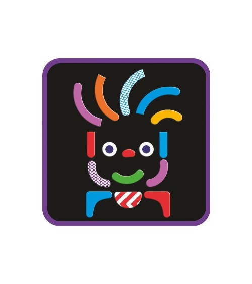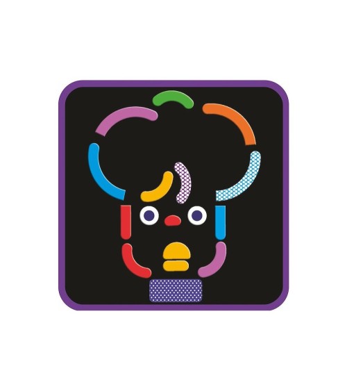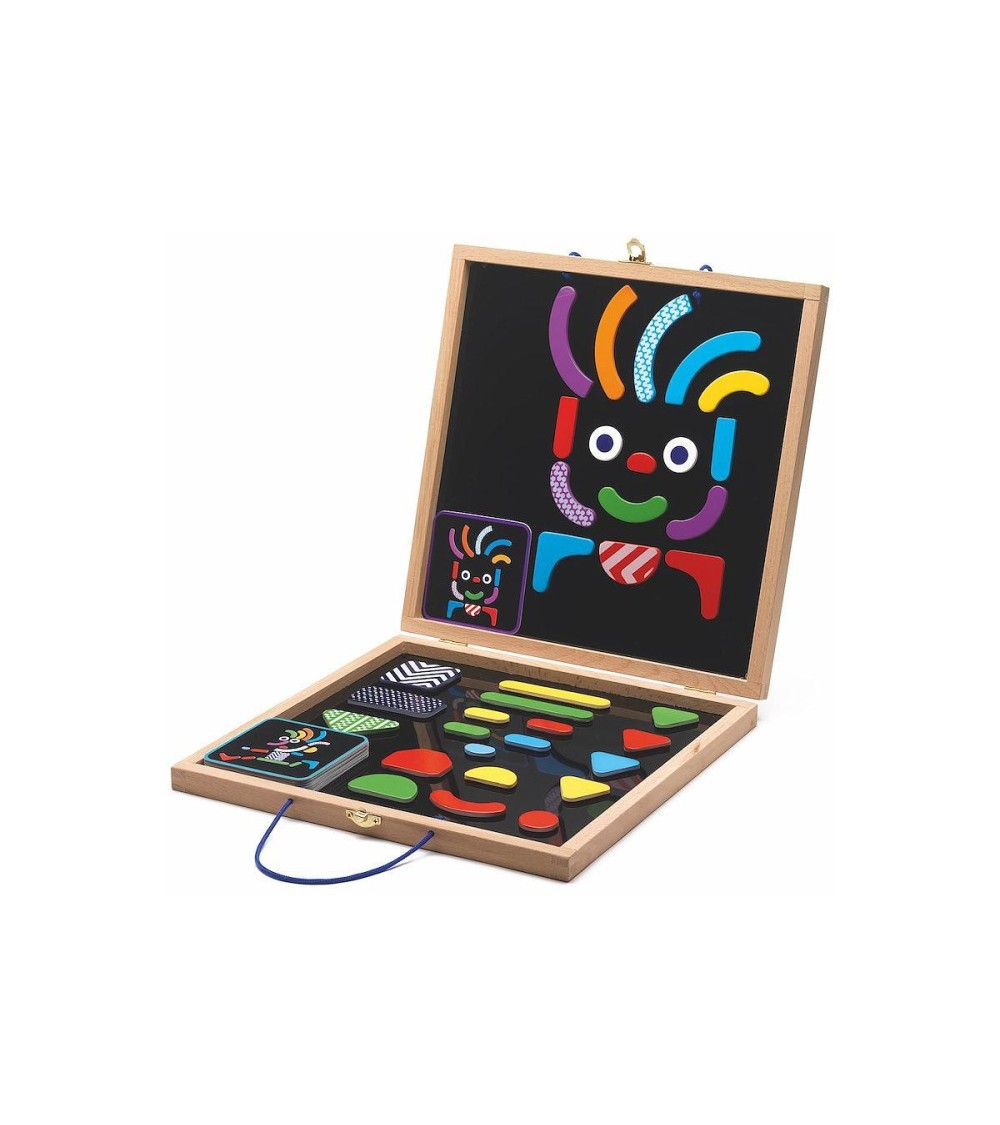 Un jolie valisette en bois contenant 35 pièces de bois aimantées et 20 cartes modèles pour s'amuser à reproduire toutes sortes de bonhommes rigolos et farfelus. L'enfant ouvre le coffret et place directement les pièces sur l'une des deux faces métalliques pour créer son personnage.