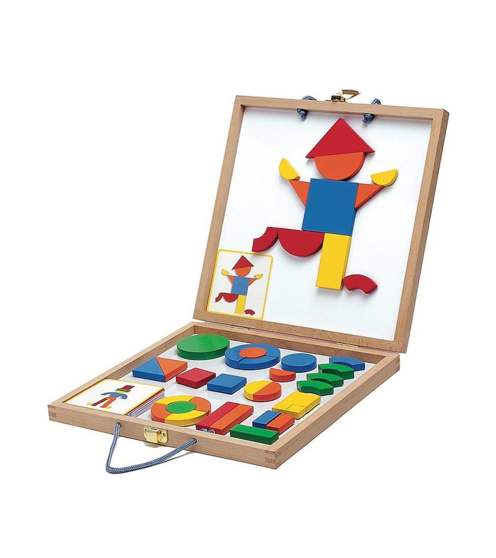 Une jolie valisette en bois contenant 42 pièces de bois aimantées et 24 modèles pour s'amuser à reproduire toutes sortes de formes : personnages, animaux, véhicules et scènes. L'enfant ouvre le coffret et place directement les pièces sur l'une des deux faces métalliques pour reproduire et créer toutes les formes.