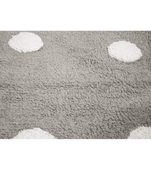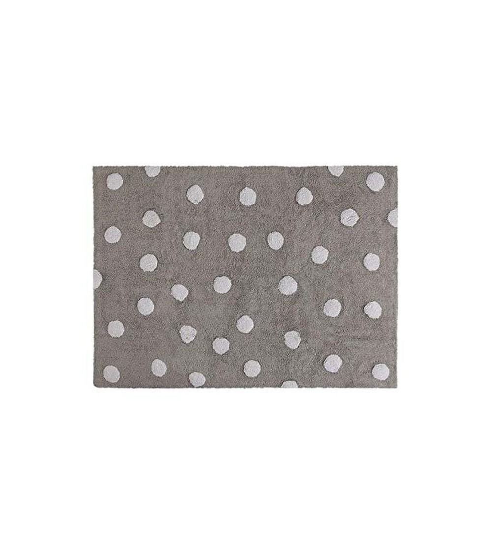 Tapis motif pois - gris - 120 x 160. Idéal dans votre intérieur ou pour une chambre d'enfant, ce joli tapis 100% coton est confortable et esthétique. Le plus de ce tapis : il est lavable en machine ! Ce tapis est fait à la main en Espagne. Livrable sous 1 ou 2 semaines. Dimensions du tapis : 120 x 160 cm