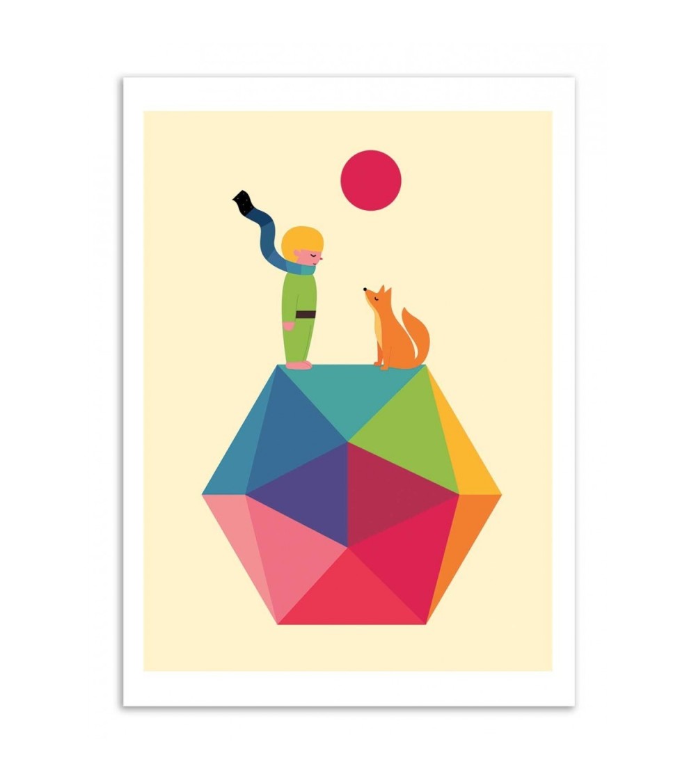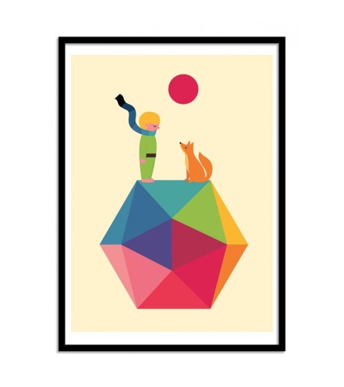 LES AFFICHES : Nos affiches sont imprimées en France, ou Union Européenne.Papier issu de forêts certifiées FSC.Affiche imprimée sur papier couché mat 250g, Haute Définition.Pour les formats d'affiches 30x40 cm : contient des marges blanches de 1,5 cm.Pour les formats d'affiches 50x70 cm : contient des marges blanches de 2 cm.OPTION CADRES : Nos cadres en bois sont fabriqués en France.Comprend une vitre en verre acrylique.Dimensions des cadres en bois 30x40 cm : Epaisseur du cadre : 15 mm, Profondeur du cadre : 20 mmDimensions des cadres en bois 50x70 cm : Epaisseur du cadre : 15 mm. Profondeur du cadre : 20 mm. Le style graphique et poétique des illustrations d'Andy Westface fait le bonheur des mordus de décoration d'intérieur. Sur ce poster nous pouvons voir le célèbre personnage d'Antoine de Saint Exupéry, Le petit Prince parlant à son ami le renard dans un espace-temps incertain. Sa planète est un mariage de triangles multicolores, toutes ces couleurs quelle poésie ! Cette référence au livre le plus vendu du monde est une idée cadeau idéale pour faire rêver les enfants !