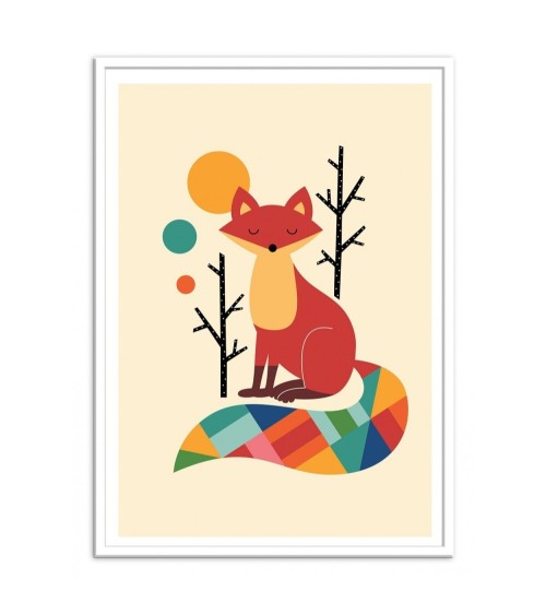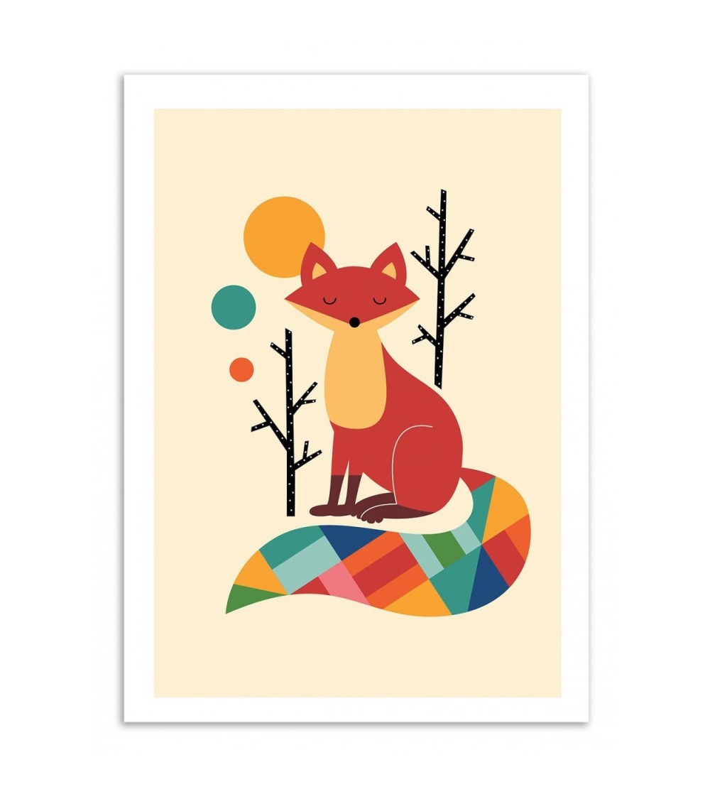 LES AFFICHES : Nos affiches sont imprimées en France, ou Union Européenne.Papier issu de forêts certifiées FSC.Affiche imprimée sur papier couché mat 250g, Haute Définition.Pour les formats d'affiches 30x40 cm : contient des marges blanches de 1,5 cm.Pour les formats d'affiches 50x70 cm : contient des marges blanches de 2 cm.OPTION CADRES : Nos cadres en bois sont fabriqués en France.Comprend une vitre en verre acrylique.Dimensions des cadres en bois 30x40 cm : Epaisseur du cadre : 15 mm, Profondeur du cadre : 20 mmDimensions des cadres en bois 50x70 cm : Epaisseur du cadre : 15 mm. Profondeur du cadre : 20 mm. Parce qu'il n'y a pas d'âge pour apprécier l'art, l'artiste Andy Westface offre à nos enfants des posters d'animaux qui les font rêver. Sur cette illustration, nous pouvons voir un adorable petit renard aux yeux clos et à la queue multicolore. En arrière-plan, la rotation du soleil et les branches de sa forêt, magique ! Cette décoration murale est une idée idéale pour apporter une touche de joie à la chambre de nos petits, et une belle façon de leur dire de que tout va bien !