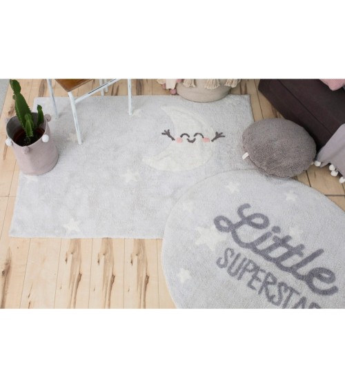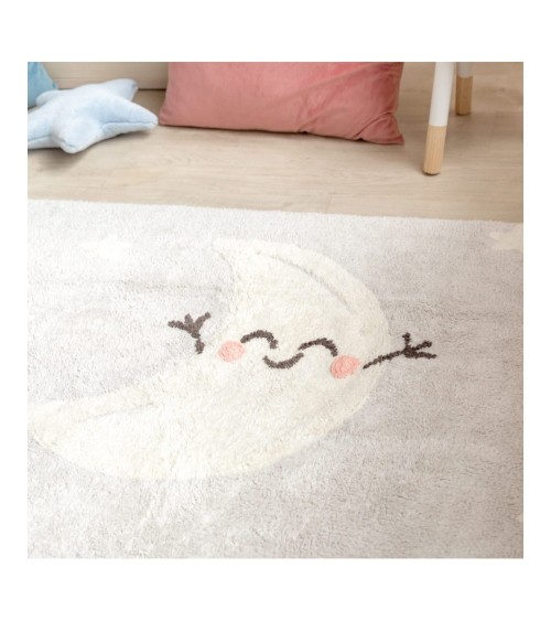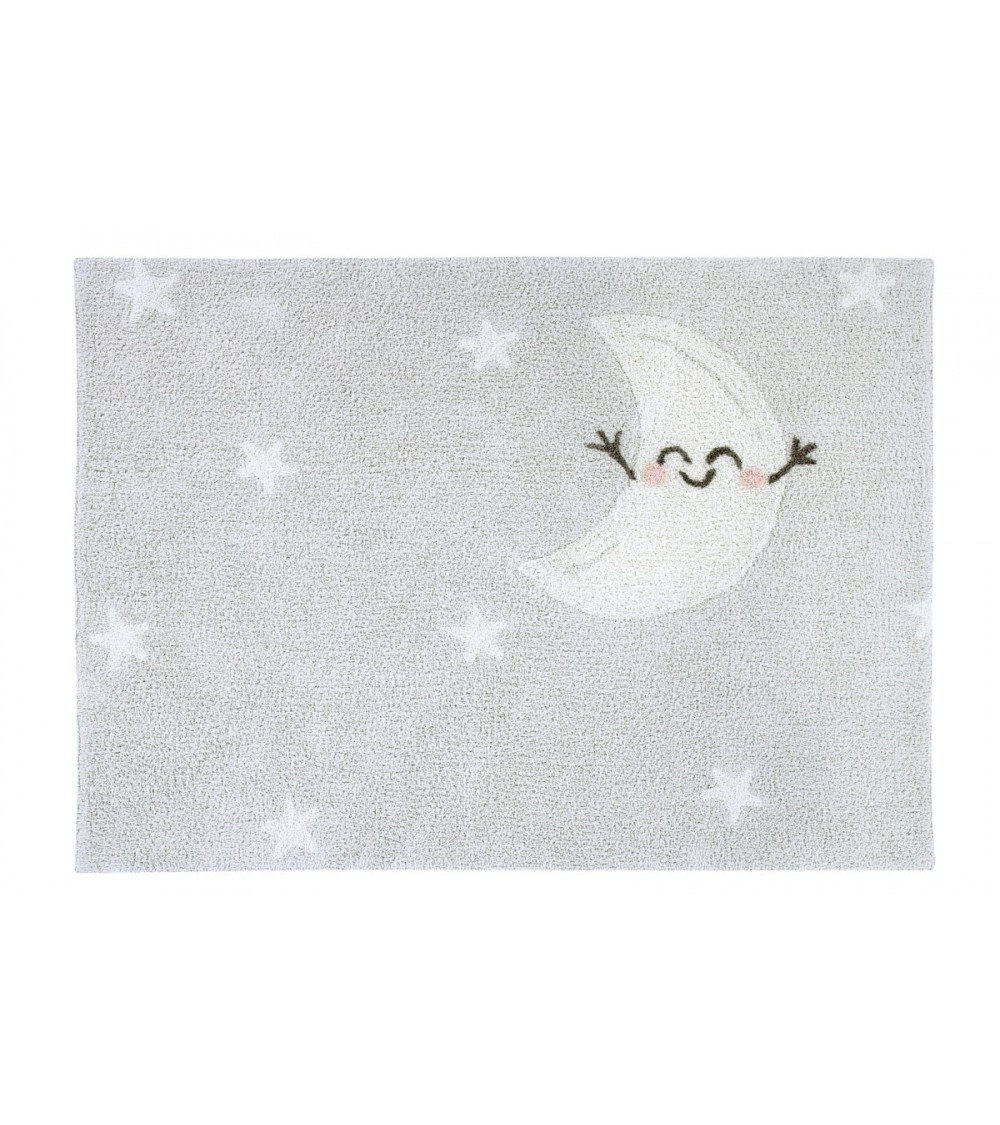 Tapis rectangulaire lavable tufté en coton, de couleur Magical Grey avec une Happy Moon et des étoiles de couleur Tender White et des détails de conception en Cotton Candy Peach et Charming Grey