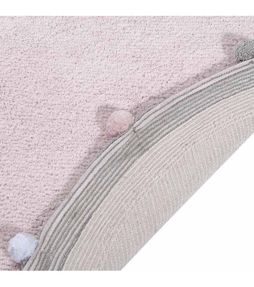 Tapis rond, base rose tendre avec bordure grise et boules de coton de couleur grise, blanche et rose autour du tapis.