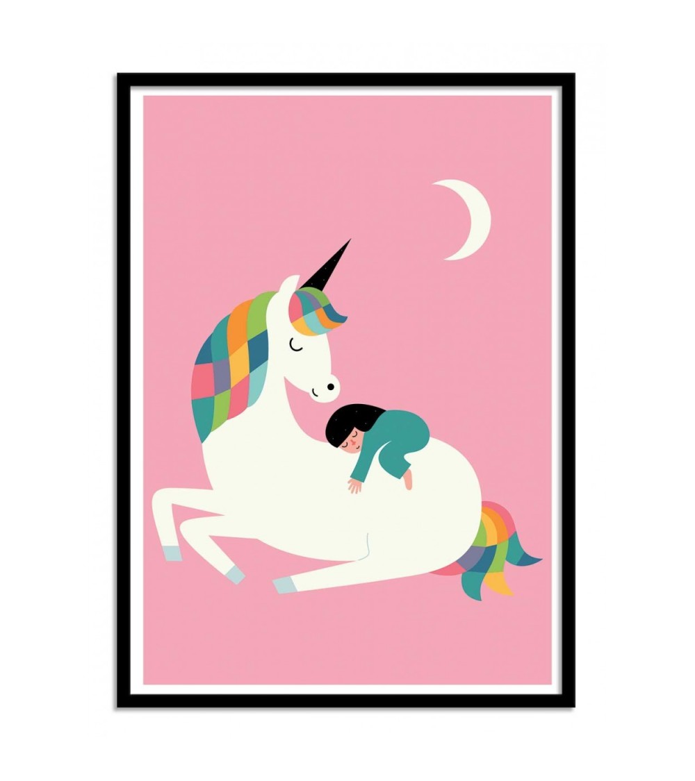 LES AFFICHES : Nos affiches sont imprimées en France, ou Union Européenne.Papier issu de forêts certifiées FSC.Affiche imprimée sur papier couché mat 250g, Haute Définition.Pour les formats d'affiches 30x40 cm : contient des marges blanches de 1,5 cm.Pour les formats d'affiches 50x70 cm : contient des marges blanches de 2 cm.OPTION CADRES : Nos cadres en bois sont fabriqués en France.Comprend une vitre en verre acrylique.Dimensions des cadres en bois 30x40 cm : Epaisseur du cadre : 15 mm, Profondeur du cadre : 20 mmDimensions des cadres en bois 50x70 cm : Epaisseur du cadre : 15 mm. Profondeur du cadre : 20 mm. Parce qu'il n'y a pas d'âge pour apprécier l'art, l'artiste Andy Westface offre à nos enfants des posters d'animaux qui les font rêver. Sur cette illustration, nous pouvons voir une adorable petite fille dormir sur le dos d'une licorne à la chevelure multicolore. En arrière-plan, un croissant de lune sur fond rose, magique ! Cette décoration murale est une idée idéale pour apporter une touche de douceur à la chambre de nos petits, et une belle façon de leur dire bonne nuit !