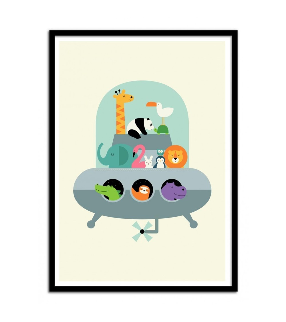 LES AFFICHES : Nos affiches sont imprimées en France, ou Union Européenne.Papier issu de forêts certifiées FSC.Affiche imprimée sur papier couché mat 250g, Haute Définition.Pour les formats d'affiches 30x40 cm : contient des marges blanches de 1,5 cm.Pour les formats d'affiches 50x70 cm : contient des marges blanches de 2 cm.OPTION CADRES : Nos cadres en bois sont fabriqués en France.Comprend une vitre en verre acrylique.Dimensions des cadres en bois 30x40 cm : Epaisseur du cadre : 15 mm, Profondeur du cadre : 20 mmDimensions des cadres en bois 50x70 cm : Epaisseur du cadre : 15 mm. Profondeur du cadre : 20 mm. Voici une jolie illustration signée Andy Westface. L'artiste spécialisé dans les dessins pour enfants adore illustrer les animaux dans un design humoristique et haut en couleurs. Sur ce poster nous pouvons voir un vaisseau / arche de Noé avec dedans : un crocodile, un hippopotame violet, un paresseux orange, un éléphant vert, un lion, un pingouin, un flamand rose, un panda, une girafe et un oiseau ! A l'aventure ! Une idée déco super pour sublimer la chambre de nos bébés !