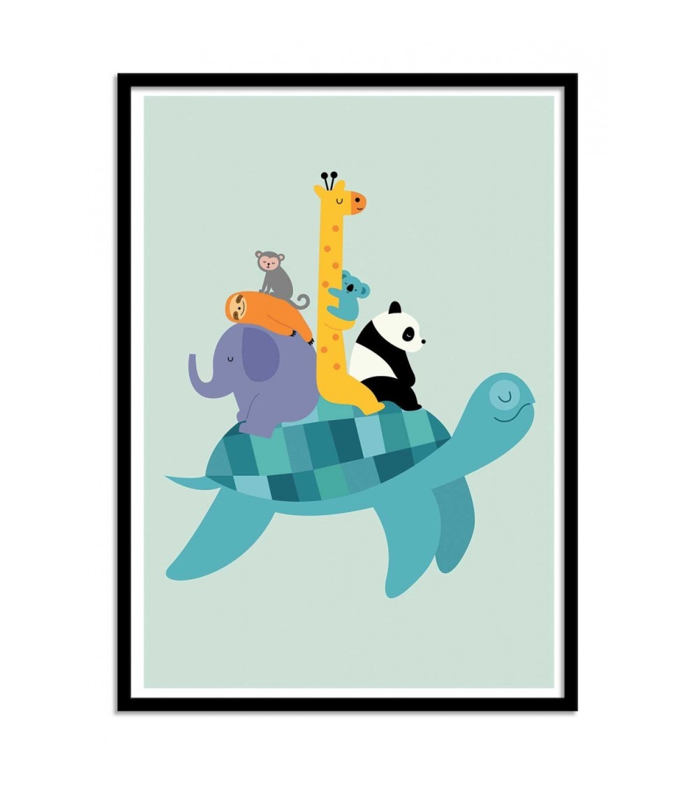 LES AFFICHES : Nos affiches sont imprimées en France, ou Union Européenne.Papier issu de forêts certifiées FSC.Affiche imprimée sur papier couché mat 250g, Haute Définition.Pour les formats d'affiches 30x40 cm : contient des marges blanches de 1,5 cm.Pour les formats d'affiches 50x70 cm : contient des marges blanches de 2 cm.OPTION CADRES : Nos cadres en bois sont fabriqués en France.Comprend une vitre en verre acrylique.Dimensions des cadres en bois 30x40 cm : Epaisseur du cadre : 15 mm, Profondeur du cadre : 20 mmDimensions des cadres en bois 50x70 cm : Epaisseur du cadre : 15 mm. Profondeur du cadre : 20 mm. Andy Westface, le maître des illustrations pour enfants est spécialisé dans les dessins de drôles et mignons d'animaux. Sur cette affiche d'art nous pouvons voir une majestueuse tortue transportant sur son dos ses amis : un éléphant, un paresseux, un panda, un singe, une girafe et un koala vert ! Un doux sourire se dessine sur leurs visages heureux ! Ce poster haut en couleur est une décoration idéale pour une chambre de bébé ou d'enfant !