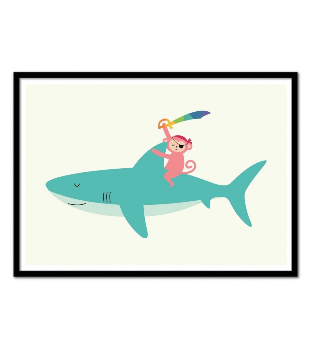 LES AFFICHES : Nos affiches sont imprimées en France, ou Union Européenne.Papier issu de forêts certifiées FSC.Affiche imprimée sur papier couché mat 250g, Haute Définition.Pour les formats d'affiches 30x40 cm : contient des marges blanches de 1,5 cm.Pour les formats d'affiches 50x70 cm : contient des marges blanches de 2 cm.OPTION CADRES : Nos cadres en bois sont fabriqués en France.Comprend une vitre en verre acrylique.Dimensions des cadres en bois 30x40 cm : Epaisseur du cadre : 15 mm, Profondeur du cadre : 20 mmDimensions des cadres en bois 50x70 cm : Epaisseur du cadre : 15 mm. Profondeur du cadre : 20 mm. Si vous cherchez un poster pour enfant au design travaillé et au message chaleureux, les illustrations d'Andy Westface vont faire votre bonheur ! L'artiste aime dessiner les animaux et nous faire ressentir tout l'amour dont ils sont constitués. Sur ce poster nous pouvons voir un singe pirate rose chevauchant un requin blanc tout en brandissant une épée multicolore. Un rodéo comique et si mignon ! Une idée cadeau géniale pour les nouveau nés et bébés !