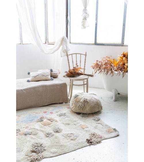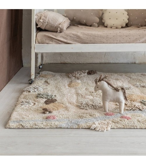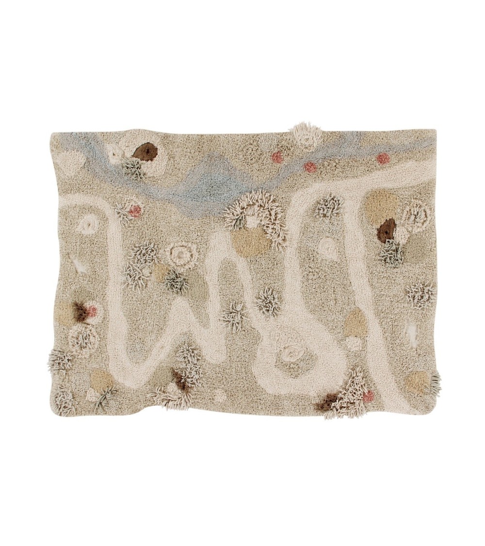 Tapis de jeu rectangulaire avec de nombreuses textures et des détails intéressants, simulant un paysage miniature avec une rivière et un chemin de promenade. Fabriqué en coton naturel et présentant différentes hauteurs de poils et techniques de tissage, ce tapis est composé de mélanges de couleurs douces naturelles, olive et bleu perle, avec des détails en rose cendré et marron. Livré avec un sac en coton pratique avec poignées et ficelle, et comprend un mini-coussin en forme de cheval.