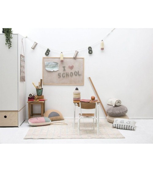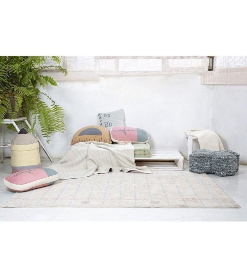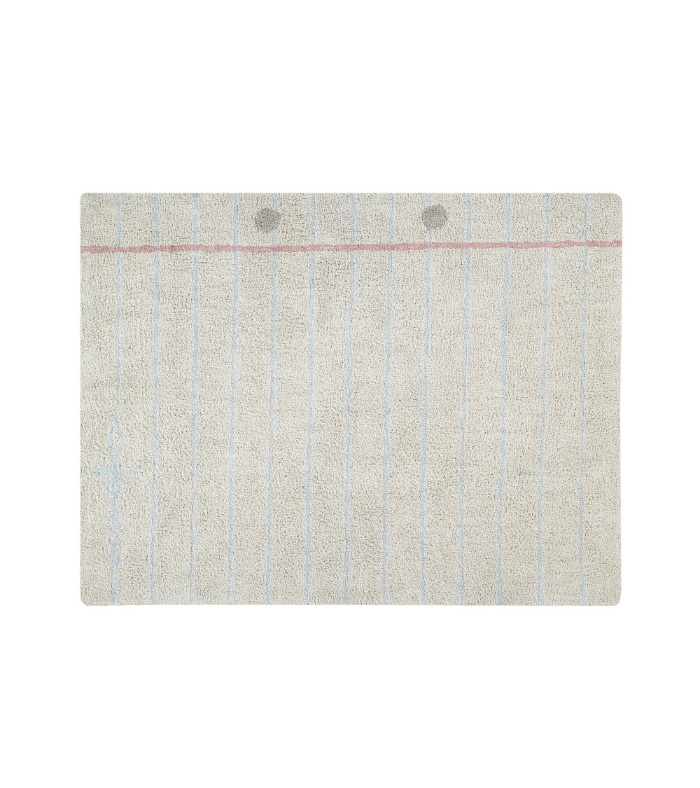 Tapis rectangulaire en base naturelle, avec des lignes en bleu et rose corail, et de gros pois gris, formant un cahier d'écolier classique