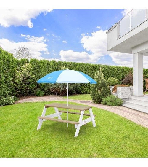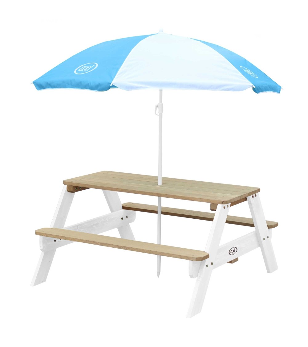 Laissez vos enfants s'asseoir confortablement à la table Nick Picnic d'AXI. Lorsque le soleil commence à briller, ils peuvent chercher un abri sous un parasol réglable en hauteur. Cette table de pique-nique est réalisée dans de belles couleurs de bois naturel et s'adapte donc bien à tout intérieur ou jardin. Il y a suffisamment d'espace à la table de pique-nique pour asseoir quatre enfants en même temps. De cette façon, ils peuvent créer, dessiner ou profiter de friandises ensemble. La table de pique-nique est en bois de hemlock (pruche) non traité chimiquement, et 100% FSC. Ce bois provient de forêts gérées de manière durable et constitue donc un choix écologique. Ce type de bois ne se fendille pas et est naturellement résistant aux intempéries comme la pluie et à la pourriture du bois. La table est également traitée avec une teinture à base d'eau, sans produits chimiques. Vous n'avez pas à traiter la table Nick Picnic avant de l'utiliser, les enfants peuvent immédiatement y jouer en toute sécurité. Dimensions: 98 x 95 x h 49cm. Garantie 10 ans