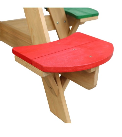 Avec la Table Arc-en-ciel UFO d'AXI, vos enfants apprécieront de s'asseoir autour d'une table avec des amis. Ils peuvent choisir leur chaise de couleur préférée (bleue, jaune, verte ou rouge) et s'asseoir pour un jeu, un pique-nique ou un après-midi de bricolage. À cette table, ils s'amusent beaucoup à l'intérieur ou à l'extérieur! Convient aux enfants de 18 mois et plus. La table de pique-nique est fabriquée à partir de bois en Hemlock (pruche) 100% FSC. Il provient de forêts gérées de manière durable et constitue donc un choix écologique. Ce bois ne se fendille pas et est naturellement résistant aux intempéries comme la pluie et donc à la pourriture du bois. La table est également traitée avec une teinture à base d'eau, sans produits chimiques. Vous n'avez pas à traiter la table UFO avant de l'utiliser, les enfants peuvent immédiatement y jouer en toute sécurité.