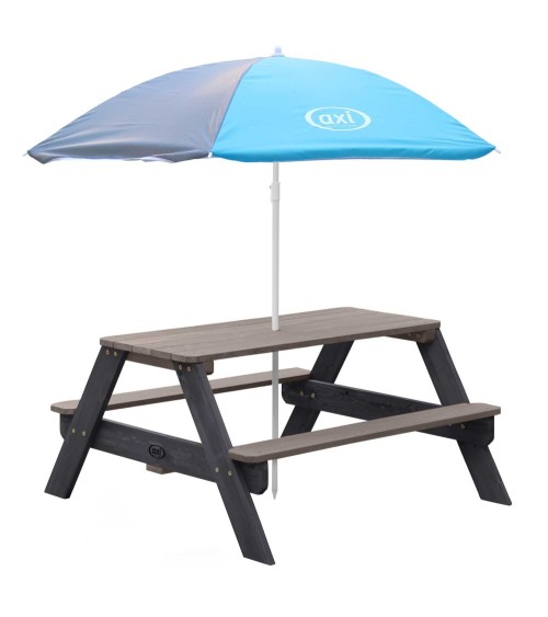Laissez vos enfants s'asseoir confortablement à la table Nick Picnic d'AXI. Lorsque le soleil commence à briller, ils peuvent chercher un abri sous un parasol réglable en hauteur. Cette table de pique-nique est réalisée dans de belles couleurs de bois naturel et s'adapte donc bien à tout intérieur ou jardin. Il y a suffisamment d'espace à la table de pique-nique pour asseoir quatre enfants en même temps. De cette façon, ils peuvent créer, dessiner ou profiter de friandises ensemble. La table de pique-nique est en bois de hemlock (pruche) non traité chimiquement, et 100% FSC. Ce bois provient de forêts gérées de manière durable et constitue donc un choix écologique. Ce type de bois ne se fendille pas et est naturellement résistant aux intempéries comme la pluie et à la pourriture du bois. La table est également traitée avec une teinture à base d'eau, sans produits chimiques. Vous n'avez pas à traiter la table Nick Picnic avant de l'utiliser, les enfants peuvent immédiatement y jouer en toute sécurité. Dimensions: 98 x 95 x h 49cm. Garantie 10 ans