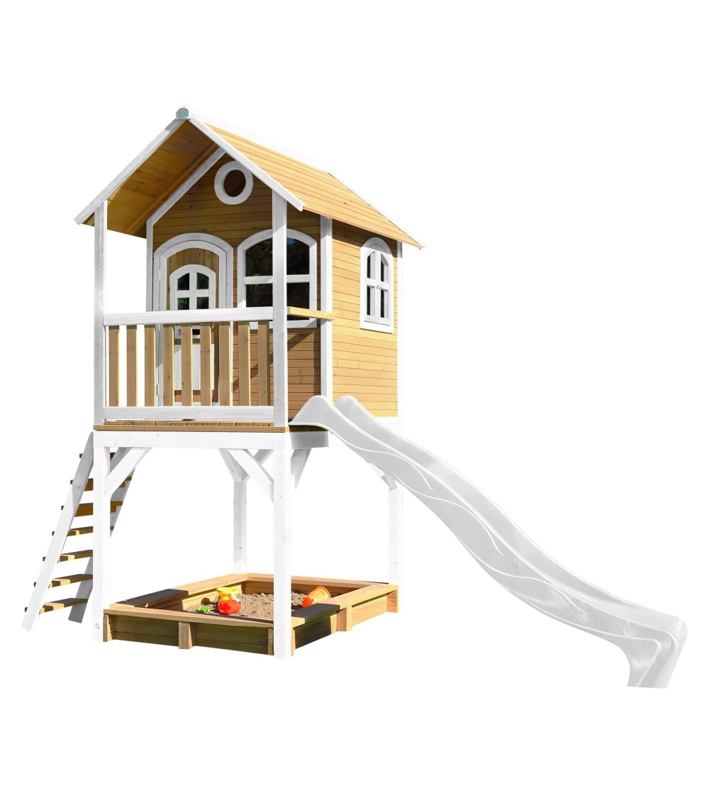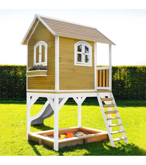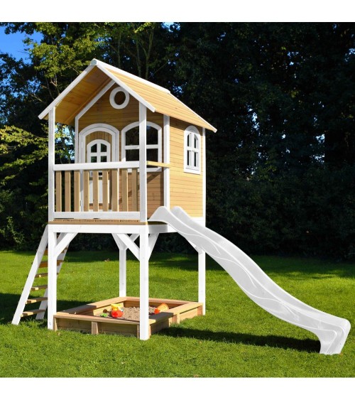 Vos enfants vont jouer pendant des heures en toute sécurité avec la maisonnette sur pilotis Sarah d'AXI Cette cabane est en bois de Hemlock, avec un toit en cyprès. Ce sont des bois très résistants, naturellement imputrescibles, insensibles aux champignons et insectes, et garantis 10 ans. Bois non-traités chimiquement, donc plus écologiques et plus surs pour les enfants. Bois 100% FSC, donc en provenance de forêts gérées selon des principes de développement durable. Le cyprès sent bon et embaumera l'intérieur de la cabane. Toute la cabane est livrée peinte et traitée avec un vernis aqueux sans produit chimique. Les fenêtres sont en plexiglass. Une fenêtre a des volets, et plusieurs s'ouvrent. Les fenêtres et la porte sont dotées d'une fermeture aimantée, et la porte a une fente pour glisser le courrier Le toboggan fait 228cm et peut être attaché des 2 cotés. Une arrivée d'eau peut y etre jointe. Le bac à sable contient jusqu'à 300 kg de sable (non fourni) Une bâche est fournie pour couvrir le bac à sable une fois le jeu terminé. La maison est facile à construire grâce à l'utilisation de panneaux de 15mm pré-percés et prêts à l'emploi. Cette maison de la marque AXI est marquée CE et testée et produite selon les normes de sécurité EN 71 afin de garantir un plaisir de jeu sûr. Pour enfants à partir de 3 ans Dimensions hors tout : 191 x 370 x hauteur 291cm, dim intérieures : 115 x 113 x h 120-166 cm. Porte : 44 x h 99 cm Hauteur plateforme : 118cm, avec échelle. Poids max recommandé sur la plateforme : 150kg. Garantie 10 ans. Peut être décorée avec accessoires vendus séparément.