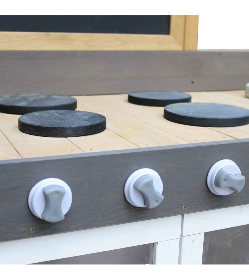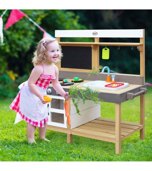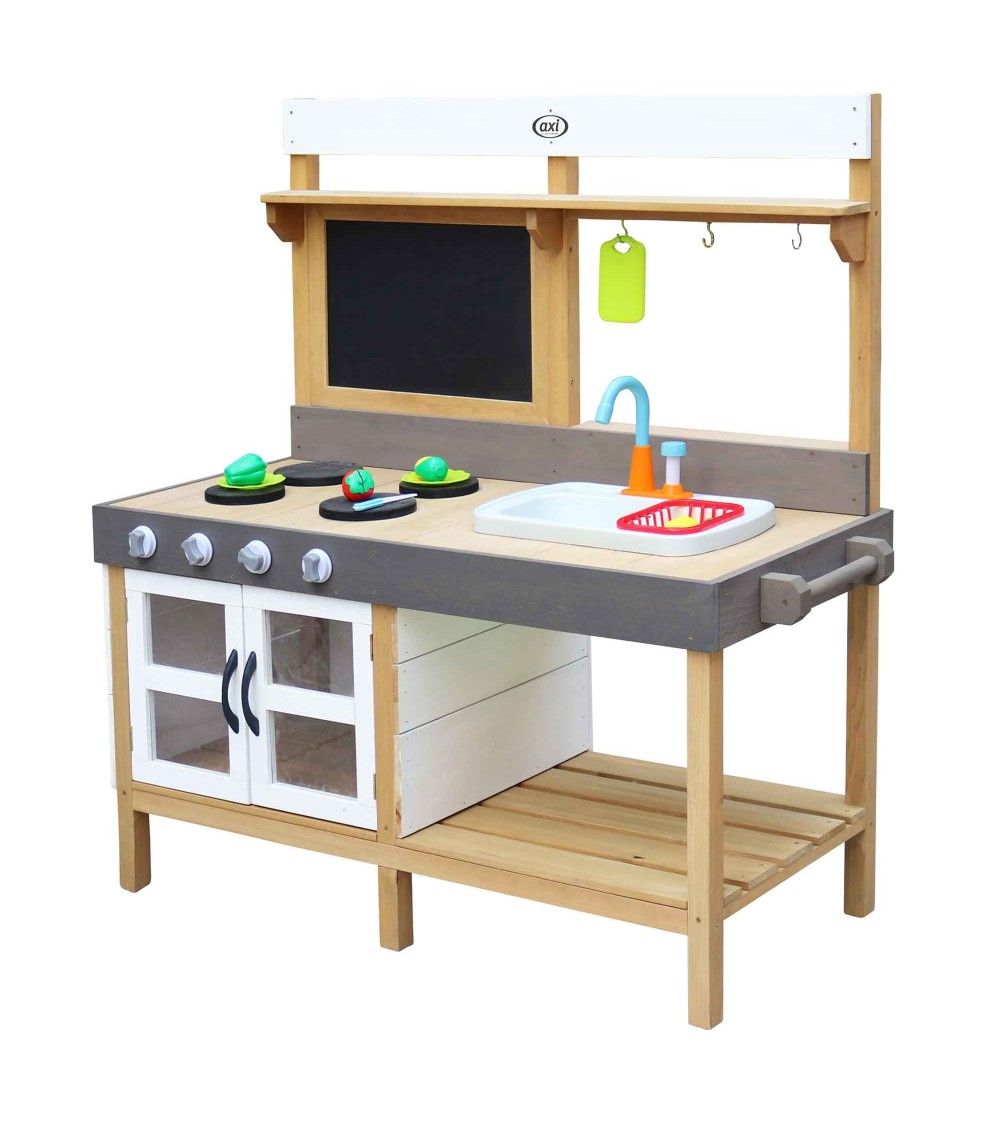 La grande cuisine en bois FSC écologique Rosa de la marque Axi pourra s'installer dans la maison comme dans le jardin. Ce qui amuse particulièrement les enfants avec cette cuisine est la possibilité de remplir le bac bleu avec de l'eau en appuyant sur la pompe pour que le robinet fonctionne. Il se vide grâce à un bouchon de vidange. Le bac se retire et se lave facilement. Les enfants s'amuseront à couper des légumes, cuisiner, faire la vaisselle ou jouerons avec du sable et de l'eau lorsqu'ils seront à l'extérieur. Les boutons de la cuisinière cliquent La planche à découper peut être suspendue à l'un des crochets. L'étagère et l'espace de rangement sous le comptoir offrent suffisamment d'espace pour ranger d'autres équipements de cuisine ou des jouets. La cuisine est livrée avec 17 accessoires : 2 assiettes, une grille, une planche à découper, un couteau et 6 fruits et légumes en 2 parties. Crochets et poignée sur le côté pour suspendre un torchon ou des accessoires. Cette cuisine de la marque Axi est fabriquée en bois de Hemlock : ce bois ne se fendille pas et est naturellement résistant aux intempéries comme la pluie et donc à la pourriture du bois. Il n'est pas traité chimiquement et il est garanti 10 ans. Il est également traité avec une teinture à base d'eau, sans produits chimiques qui n'est donc pas nocive pour l'environnement et sans danger pour les enfants Ce bois est 100% FSC : il provient également de forêts gérées de manière durable et constitue donc un choix écologique. Assemblage facile grâce aux pièces pré-assemblées Convient aux enfants de 3 ans et plus. - Bois de Hemlock FSC 100% - Pour les enfants à partir de 3 ans - Dimensions : L 115 x l 50 H 120 cm - Hauteur du plan de travail : 60 cm - Poids : 22,5 kg - Livré en 1 colis