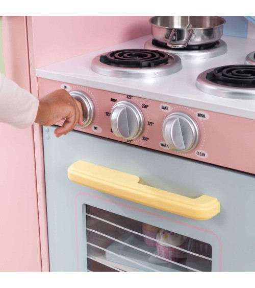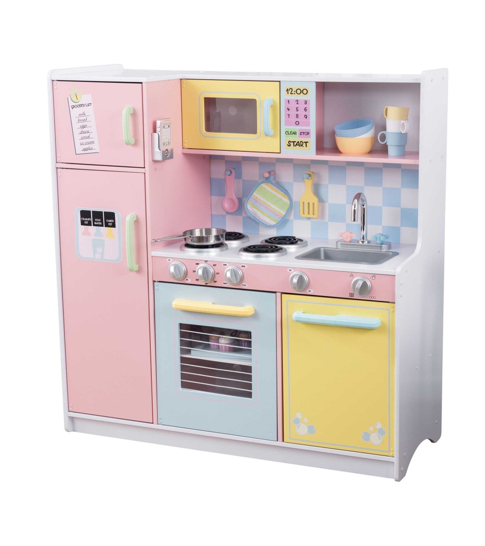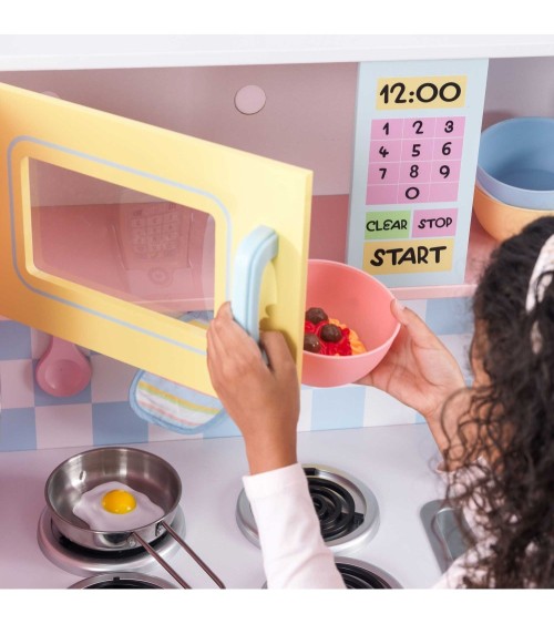 Cuisine en bois de chez KidKraft aux couleurs pastel constituée d'un four avec des charnières latérales, d'un four à micro onde, de 4 plaques, d'un évier amovible, d'un réfrigérateur et un congélateur, d'un placard et une étagère de rangement, d'un téléphone sans fil. Dimensions : 107 x 44 x 109 cm. A monter. Dès 3 ans.