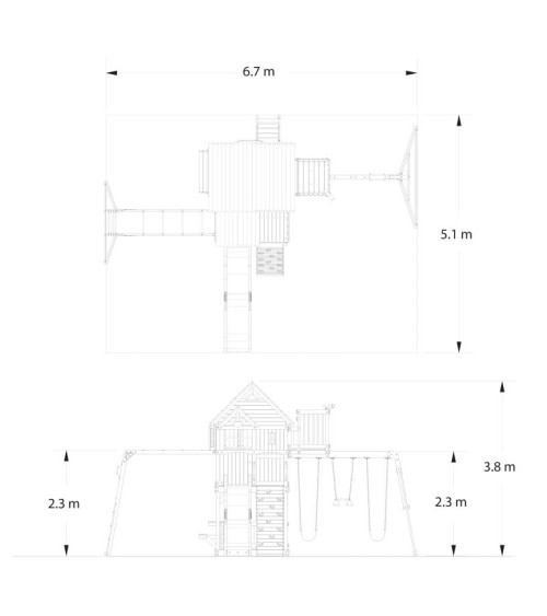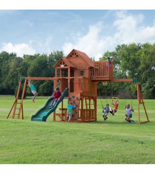 Une construction entièrement en cèdre, la très grande aire de jeux Skyfort II de la marque Backyard Discovery sera un grand espace de jeux, d'activité, de détente et rêves pour les enfants. Se suspendre sur les barres de singe, grimper sur le mur d'escalade, dévaler le long du toboggan de plus de 3 mètres, se balancer à 4 en même temps ou profiter d'une pause autour de la table de pique-nique, l'aire de jeux Skyfort II deviendra le point central du jardin. Ce produit est conçu et fabriqué par Backyard Discovery, leader aux USA pour les structures de jeu en bois pour enfants. Cette aire de jeu est faite uniquement pour un usage pour chez les particuliers et n'est pas adaptée pour les collectivités. Équipement de l'aire de jeux : Clubhouse surélevé avec toit en bois, fenêtres, entrée couverte. Véranda avant avec balcon ''Nid de corbeau'' avec télescope Pont inférieur avec table de pique-nique Barres de singe robuste Deux balançoires à siège souple et à courroie en plastique souple réglables en hauteur (pas de chaines) et un trapèze ! Toboggan de 305 cm. Bac à sable pouvant contenir environ 260 kg de sable. Mur d'escalade et échelle - Fabriqué en bois de cèdre. Ce bois résiste aux insectes, est imputrescible et ne se désintègre pas. Bois sans produits chimiques. - La teinture utilisée à des fins esthétique est à base aqueuse. - Le bois est pré-coupé, pré-percé, pré-teint. - Montage par 2 adultes recommandé - Poids supporté : 68 kg par enfant pour un usage individuel. 54 kg par enfant pour un usage multiple. - Un maximum de 9 enfants est recommandé. - Recommandé pour les enfants âgés de 3 à 10 ans. - Garantie par Backyard Discovery : 2 ans - Dimensions hors tout : 670 x 510 x 380 cm. Hauteur portique/ barres de singe : 2,3 m. - Tour de jeu (Lxlxh) : 510 x 670 x 380 cm - Pont supérieur : 152 x 203 cm - Pont inférieur : 89 x 157 cm - Nid de corneille : 99 x 68 cm - Hauteur du pont supérieur : 152 cm - Hauteur du nid de corneille : 230 cm - Poids : 306,59 kg - Livré e