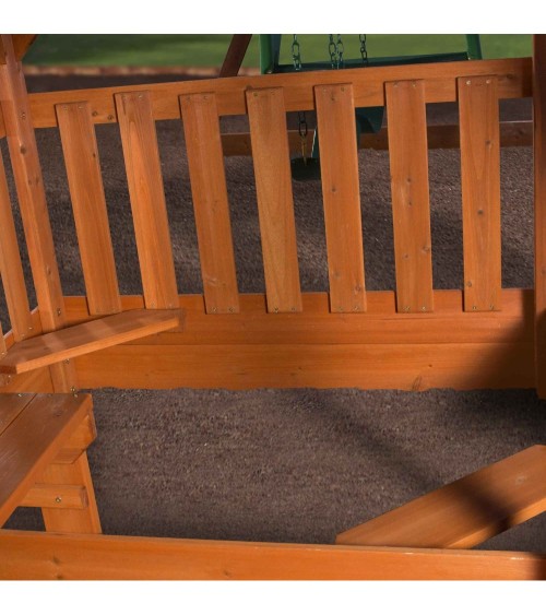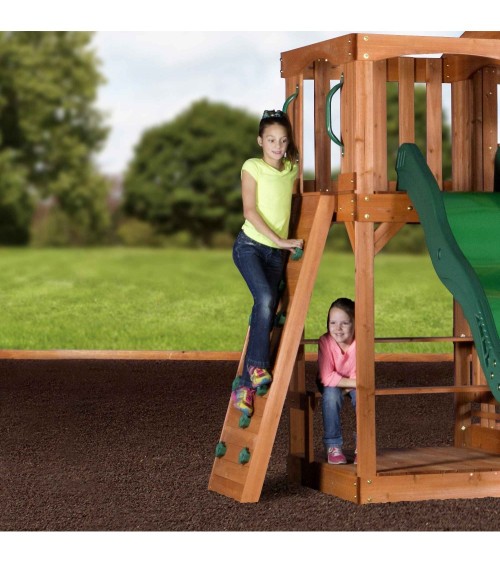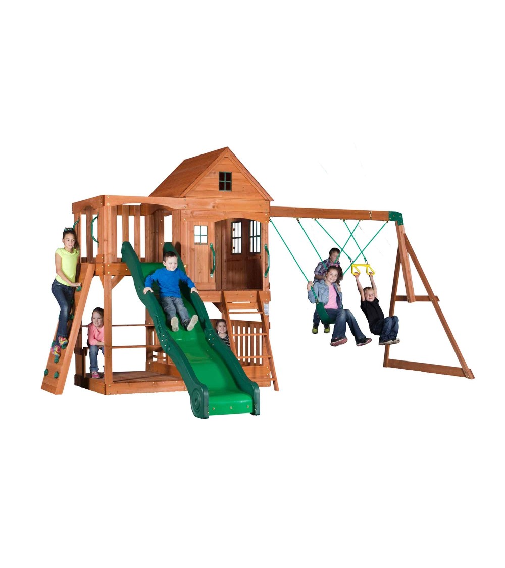 Aire de jeux Hill Crest de Backyard comprend : deux balançoires + une balançoire 2 sièges pour 2 enfants, un toboggan de 3m de long. Accès à la plateforme du toboggan par une échelle ou par le mur d'escalade. Sous le toboggan une estrade avec un banc et une table de pique-nique. Sous la maisonnette, un bac à sable. Structure est en bois de cèdre tropical. Dimensions hors tout: 537 x 409 x H: 290 cm. Hauteur portique: 190cm Pour les enfants à partir de 4 ans. Livré avec le set de fixation