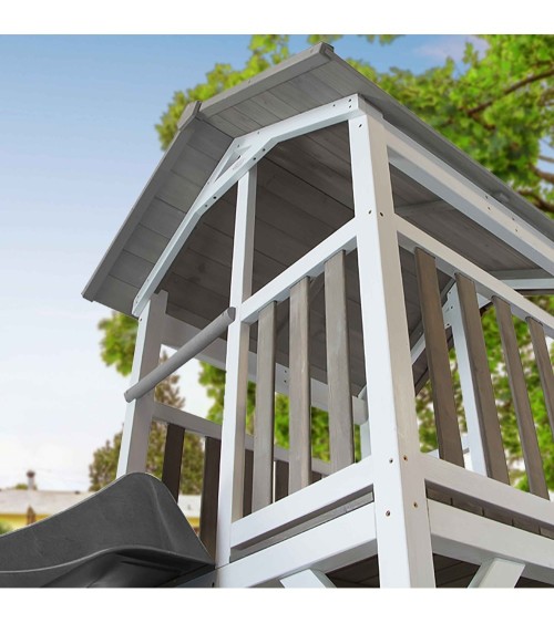Voici une structure de jeu comme à la plage, ouverte sur le monde à 360 degrés. En bois de Hemlock , un bois très résistant, naturellement imputrescible, insensible aux champignons et insectes. Bois non-traité chimiquement, donc plus écologique et plus sur pour les enfants.100% FSC , donc en provenance de forêts gérées selon des principes de développement durable . Facile à construire en raison de l'utilisation de panneaux pré-percés prêts à l'emploi et déjà peint et traités avec un vernis à base aqueuse non chimique. Garantie 10 ans !! Elle dispose d'un toboggan de 220 cm avec raccordement d'eau, et d'un bac à sable installé sous la plateforme, pour environ 125 kg de sable, dim 105 x 101 x 10 cm. Hauteur de la plate-forme : 117,5 cm Le portique est entièrement en bois et comporte des entretoises pour une stabilité accrue. Inclut : 2 sièges de balançoire en bois réglable en hauteur. 2 ancrages au sol pour plus de stabilité et de sécurité. Hauteur portique: 207 cm Support d'escalade avec barres de singe pour grimper encore plus haut et s'amuser à se balancer Poids maximum sur la plateforme: 150 kg , 150 kg pour la balançoire et 100kg pour le cadre d'escalade ( barres de singe) Cadre composé de poutres de 7 cm d'épaisseur Dimensions ''hors tout'' : 519 x 349 x h 242 cm . Convient aux enfants de 3 ans et plus. Les tours de jeu AXI portent le marquage CE et ont été testées et produites conformément aux normes de sécurité EN 71 pour garantir la sécurité du jeu.