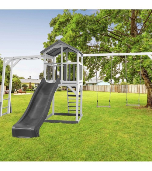 Aire de jeux 2 balançoires échelle de singe et toboggan gris