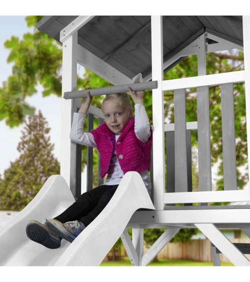 Voici une structure de jeu comme à la plage, ouverte sur le monde à 360 degrés. En bois de Hemlock , un bois très résistant, naturellement imputrescible, insensible aux champignons et insectes. Bois non-traité chimiquement, donc plus écologique et plus sur pour les enfants.100% FSC , donc en provenance de forêts gérées selon des principes de développement durable . Facile à construire en raison de l'utilisation de panneaux pré-percés prêts à l'emploi et déjà peint et traités avec un vernis à base aqueuse non chimique. Garantie 10 ans !! Elle dispose d'un toboggan de 220 cm avec raccordement d'eau, et d'un bac à sable installé sous la plateforme, pour environ 125 kg de sable, dim 105 x 101 x 10 cm. Hauteur de la plate-forme : 117,5 cm Le portique est entièrement en bois et comporte des entretoises pour une stabilité accrue. Inclut : Un siège de balançoireréglable en hauteur. 2 ancrages au sol pour plus de stabilité et de sécurité. Hauteur portique: 207 cm Support d'escalade avec barres de singe pour grimper encore plus haut et s'amuser à se balancer Poids maximum sur la plateforme: 150 kg , 150 kg pour la balançoire et 100kg pour le cadre d'escalade ( barres de singe) Cadre composé de poutres de 7 cm d'épaisseur Dimensions ''hors tout'' : 446 x 349 x h 242 cm . Convient aux enfants de 3 ans et plus. Les tours de jeu AXI portent le marquage CE et ont été testées et produites conformément aux normes de sécurité EN 71 pour garantir la sécurité du jeu.