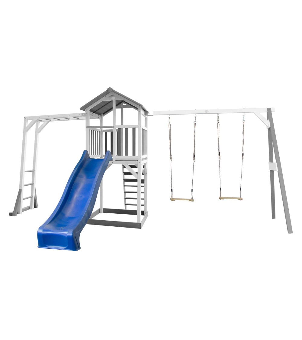 Aire de jeux 2 balançoires échelle de singe et toboggan bleu