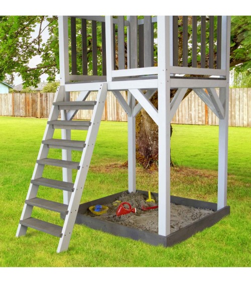 Voici une structure de jeu comme à la plage, ouverte sur le monde à 360 degrés. En bois de Hemlock , un bois très résistant, naturellement imputrescible, insensible aux champignons et insectes. Bois non-traité chimiquement, donc plus écologique et plus sur pour les enfants.100% FSC , donc en provenance de forêts gérées selon des principes de développement durable . Facile à construire en raison de l'utilisation de panneaux pré-percés prêts à l'emploi et déjà peint et traités avec un vernis à base aqueuse non chimique. Garantie 10 ans !! Elle dispose d'un toboggan de 220 cm avec raccordement d'eau, et d'un bac à sable installé sous la plateforme, pour environ 125 kg de sable, dim 105 x 101 x 10 cm. Hauteur de la plate-forme : 117,5 cm Le portique est entièrement en bois et comporte des entretoises pour une stabilité accrue. Inclut : Un siège de balançoireréglable en hauteur. 2 ancrages au sol pour plus de stabilité et de sécurité. Hauteur portique: 207 cm Support d'escalade avec barres de singe pour grimper encore plus haut et s'amuser à se balancer Poids maximum sur la plateforme: 150 kg , 150 kg pour la balançoire et 100kg pour le cadre d'escalade ( barres de singe) Cadre composé de poutres de 7 cm d'épaisseur Dimensions ''hors tout'' : 446 x 349 x h 242 cm . Convient aux enfants de 3 ans et plus. Les tours de jeu AXI portent le marquage CE et ont été testées et produites conformément aux normes de sécurité EN 71 pour garantir la sécurité du jeu.