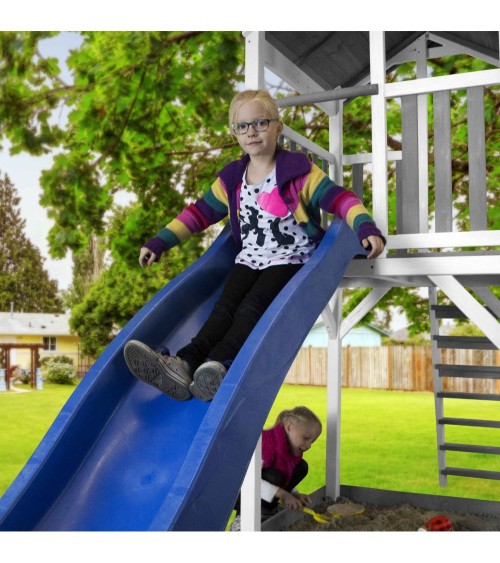 Voici une structure de jeu comme à la plage, ouverte sur le monde à 360 degrés. En bois de Hemlock , un bois très résistant, naturellement imputrescible, insensible aux champignons et insectes. Bois non-traité chimiquement, donc plus écologique et plus sur pour les enfants.100% FSC , donc en provenance de forêts gérées selon des principes de développement durable . Facile à construire en raison de l'utilisation de panneaux pré-percés prêts à l'emploi et déjà peint et traités avec un vernis à base aqueuse non chimique. Garantie 10 ans !! Elle dispose d'un toboggan de 220 cm avec raccordement d'eau, et d'un bac à sable installé sous la plateforme, pour environ 125 kg de sable, dim 105 x 101 x 10 cm. Hauteur de la plate-forme : 117,5 cm Le portique est entièrement en bois et comporte des entretoises pour une stabilité accrue. Inclut : Un siège de balançoireréglable en hauteur. 2 ancrages au sol pour plus de stabilité et de sécurité. Hauteur portique: 207 cm Support d'escalade avec barres de singe pour grimper encore plus haut et s'amuser à se balancer Poids maximum sur la plateforme: 150 kg , 150 kg pour la balançoire et 100kg pour le cadre d'escalade ( barres de singe) Cadre composé de poutres de 7 cm d'épaisseur Dimensions ''hors tout'' : 446 x 349 x h 242 cm . Convient aux enfants de 3 ans et plus. Les tours de jeu AXI portent le marquage CE et ont été testées et produites conformément aux normes de sécurité EN 71 pour garantir la sécurité du jeu.